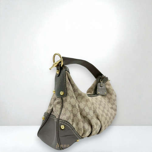 • JA1812 GUCCI包包 緹花布拚鐵灰皮革抓皺單肩包211966 (桃園店)