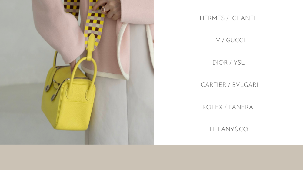 HERMES愛馬仕、CHANEL香奈兒、LOUIS VUITTON路易威登、GUCCI古馳、DIOR迪奧、BV寶緹嘉、FENDI芬迪、BALENCIAGA巴黎世家、PRADA普拉達、VERSACE凡賽斯、CELINE賽琳、YVES SAINT LAURENT聖羅蘭、CHLOE蔻依/珂洛艾伊、、LOEWE羅威、BURBERRY巴寶莉、Bvlgari寶格麗、 Issey Miyake三宅一生、 Longchamp瓏驤、Valentino范倫鐵諾等名包。