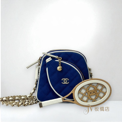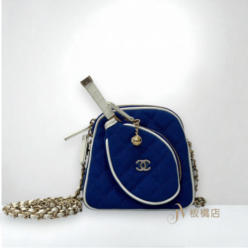 JS1131 CHANEL包包 網球拍拚藍色帆布白滾邊鏈條包 (板橋店)