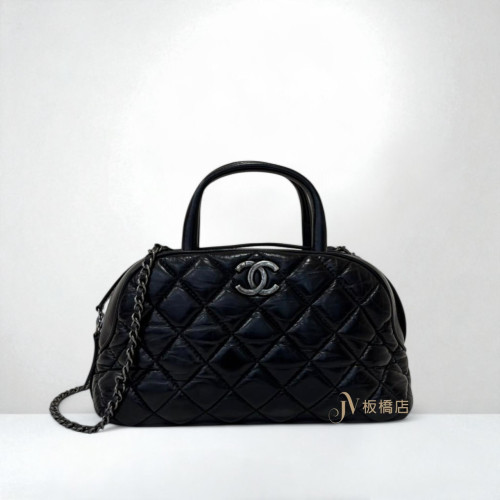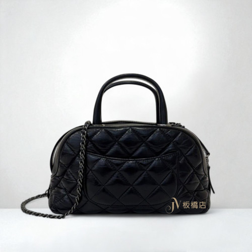 JS1170 CHANEL包包 黑色菱格油蠟牛皮復古銀釦小號保齡球包 (板橋店)