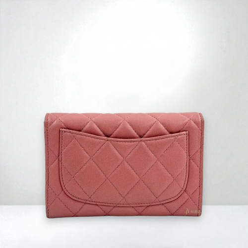 JA2114 CHANEL皮夾 粉色羊皮銀釦下蓋中夾 (桃園店)