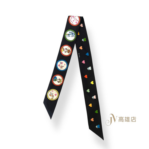JK1540 Hermes絲巾黑底圓形馬兒國王皇后圖案彩色愛心Tea Time Twilly H063782S(喬萱高雄店)