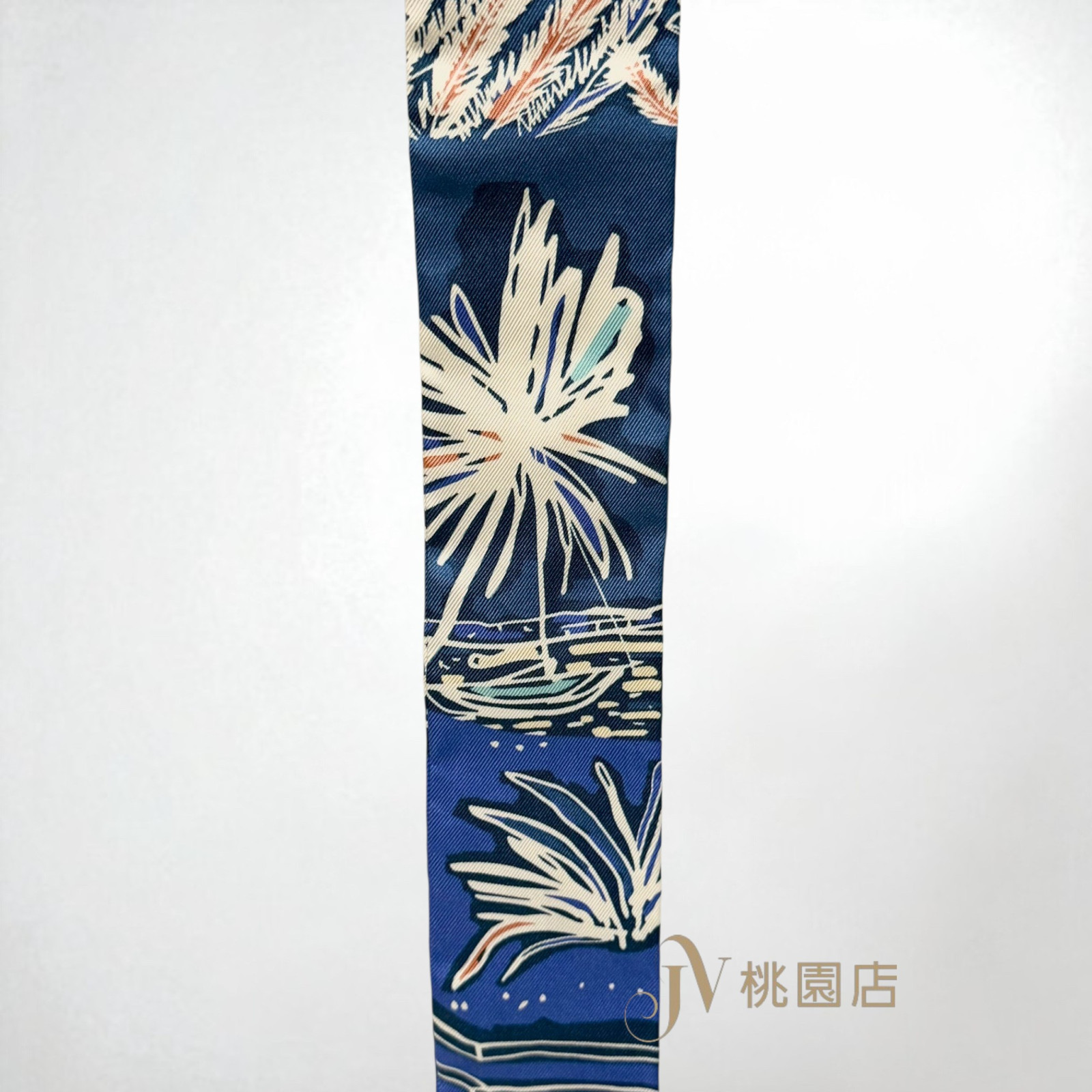 路徑: 首頁 / 精品賣場 / Hermes / Hermes-配件 / JA0432 HERMES絲巾 藍底白花燕子圖單條TWILLY (桃園店)