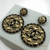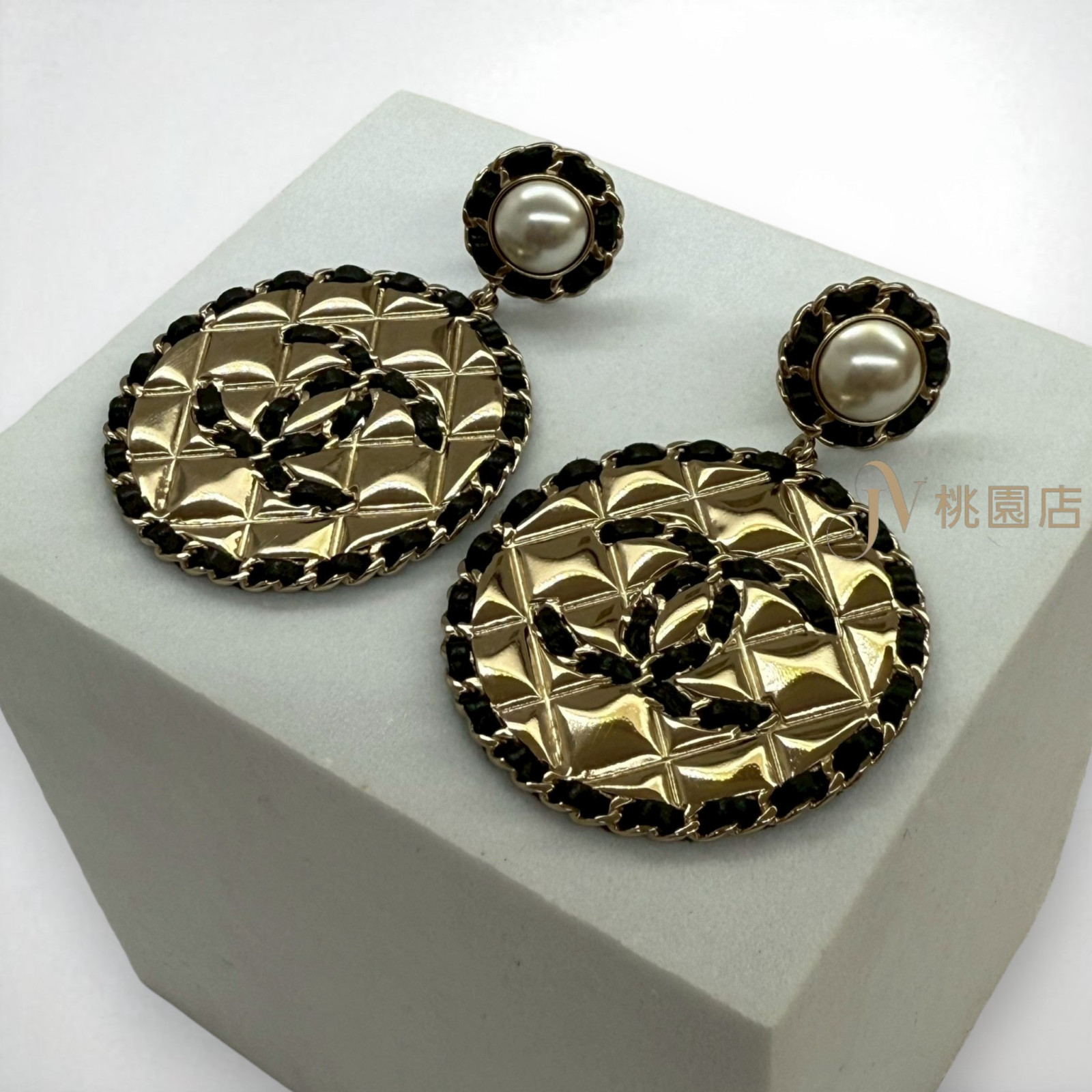 JA0933 CHANEL耳環 金色圓形菱格紋皮穿鍊垂墜耳環 (桃園店)