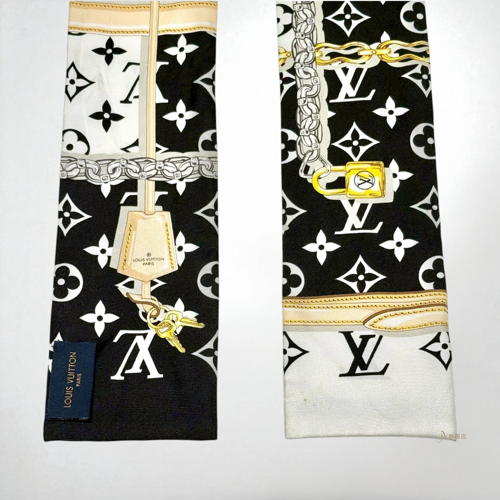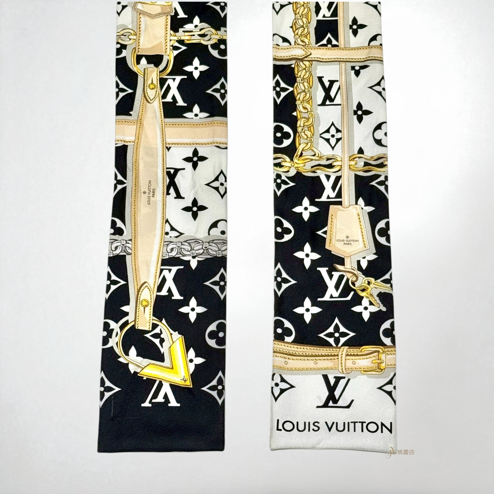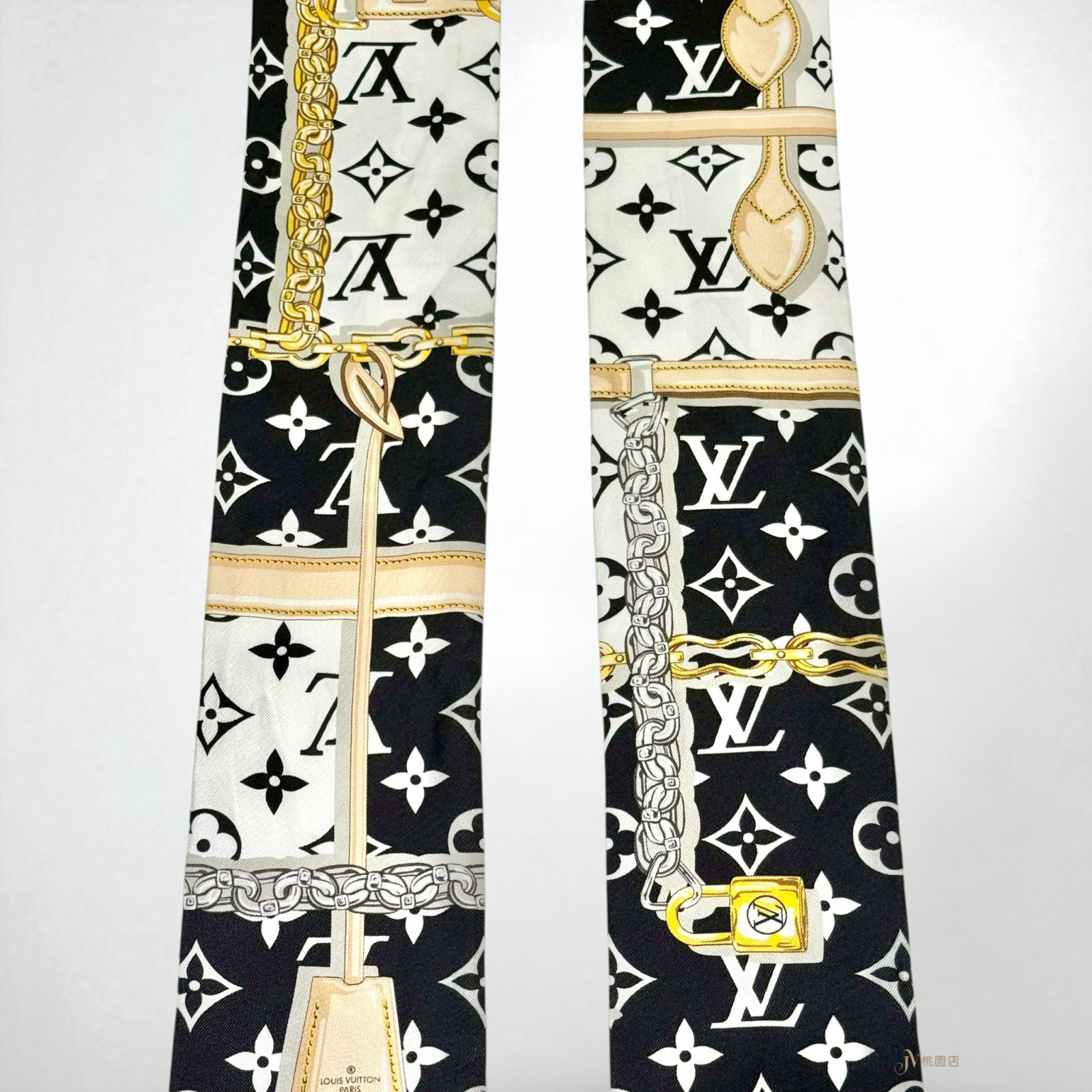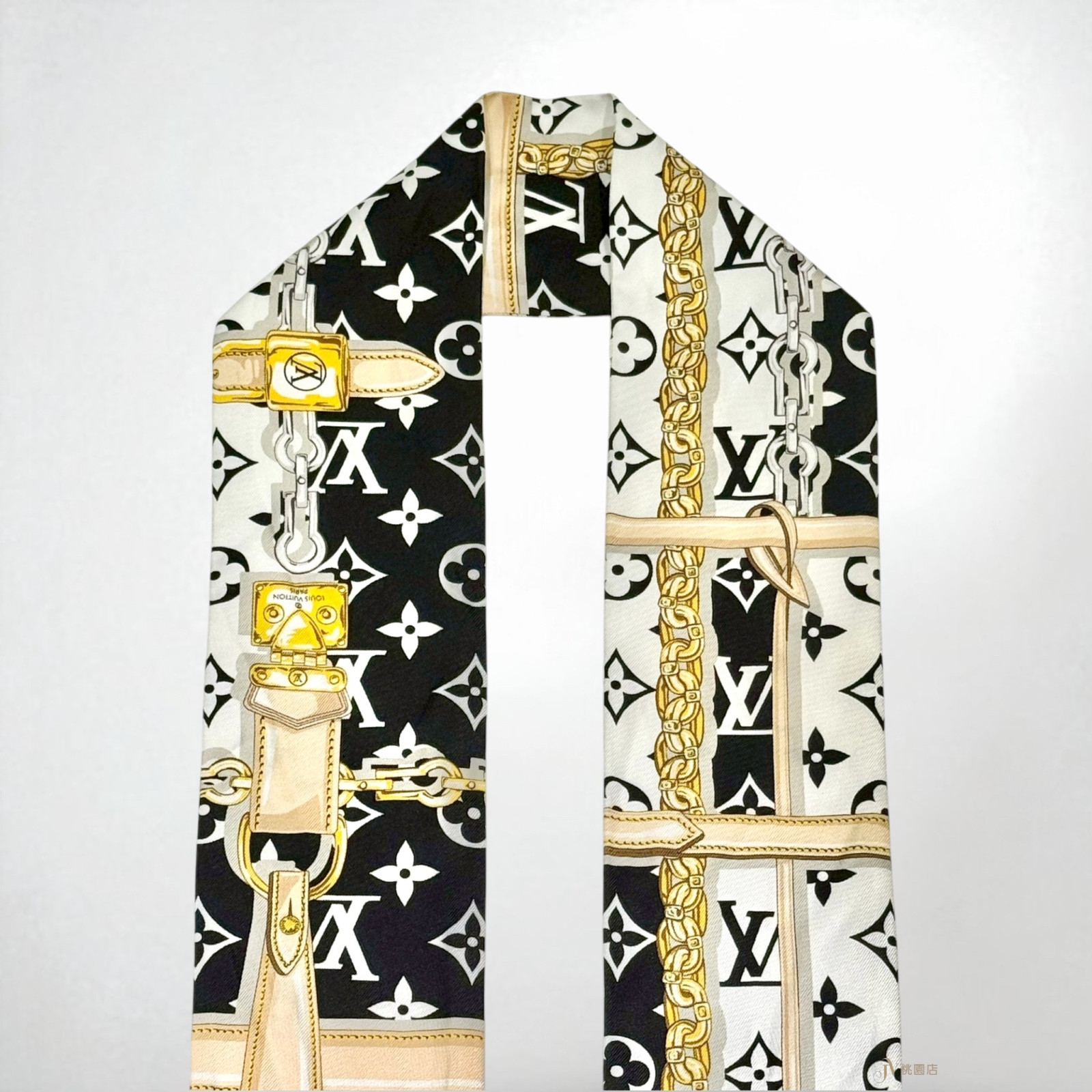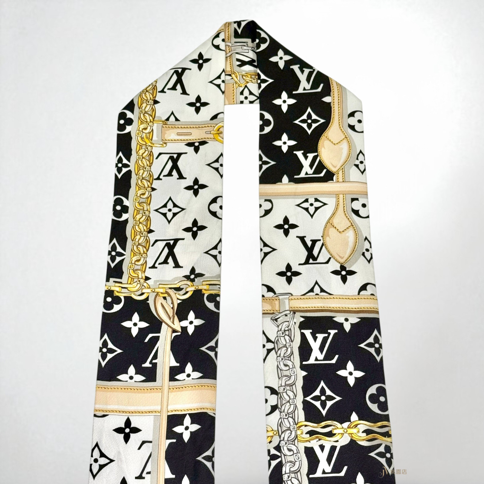 JA1806 LV絲巾 黑白老花拼皮繩圖騰twilly寬絲巾M78656 (桃園店)