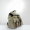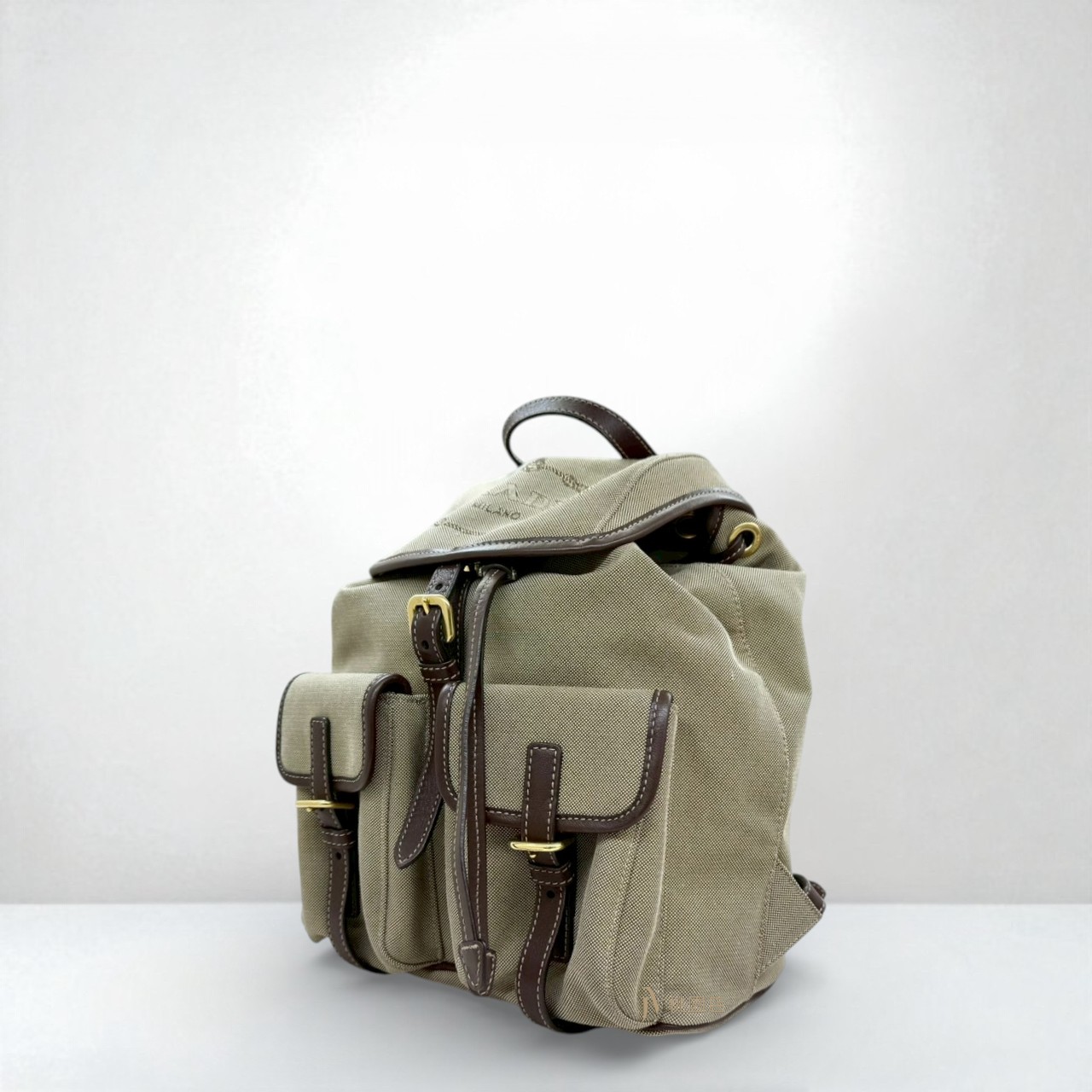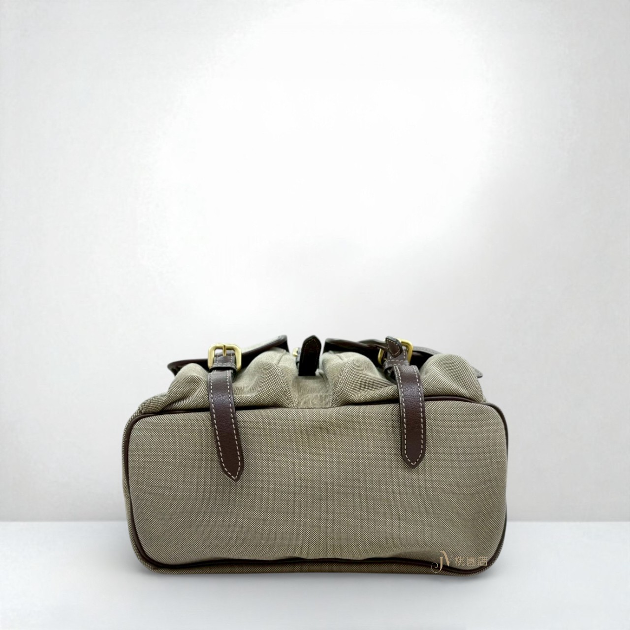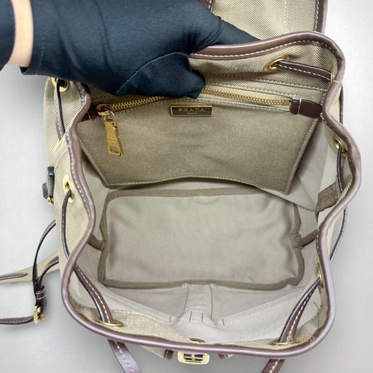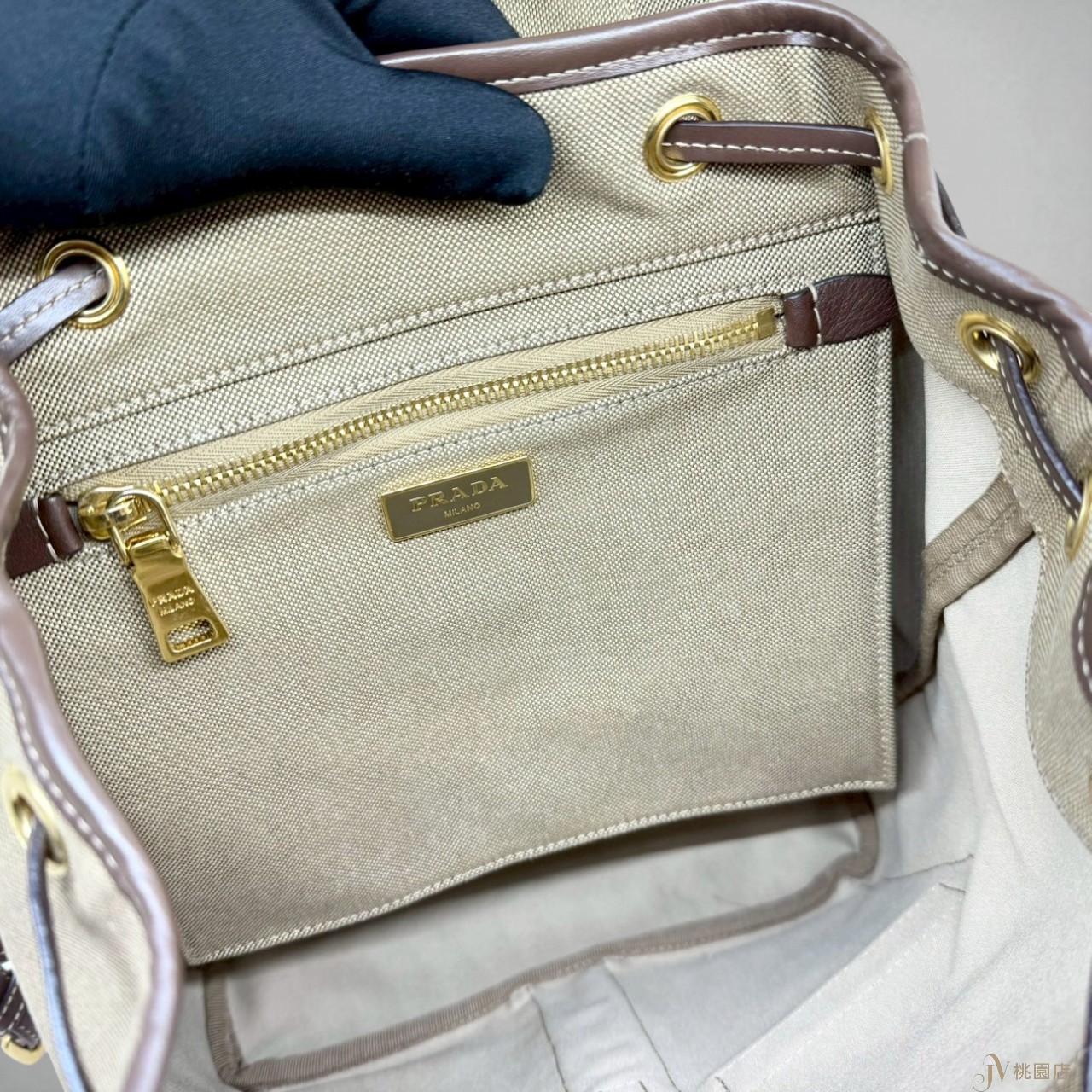 JA2053 PRADA包包 卡其帆布拚咖啡滾邊小號束口後背包 (桃園店)
