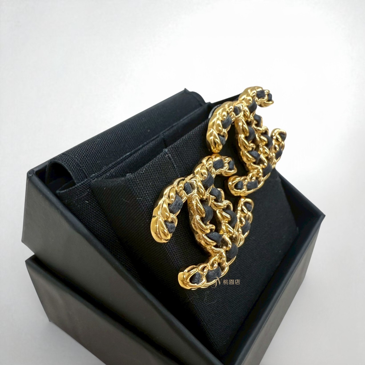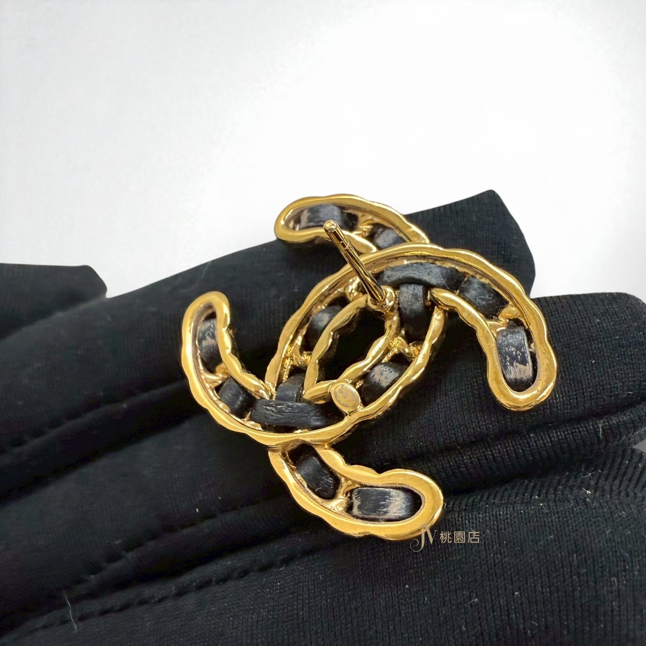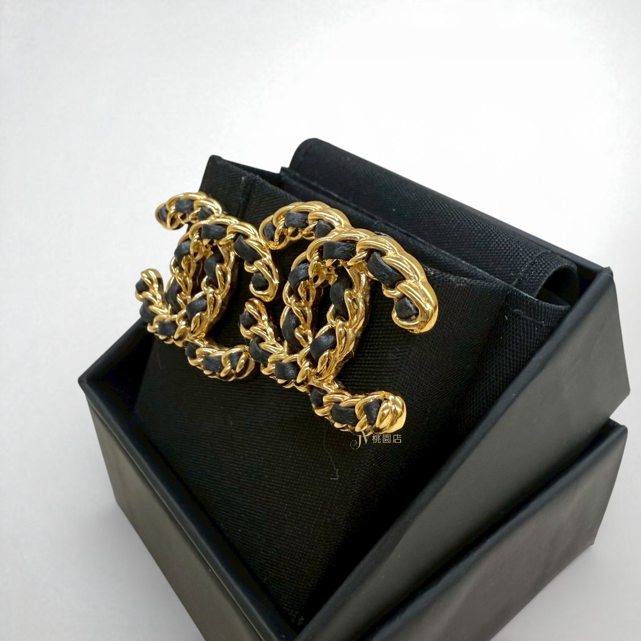 JA2085 CHANEL耳環 黑金皮穿鍊雙C造型耳環 (桃園店)