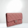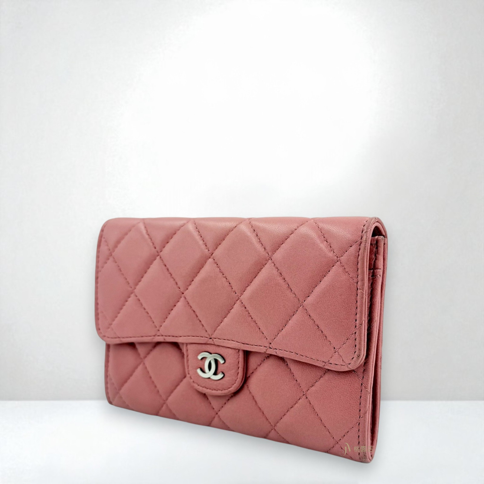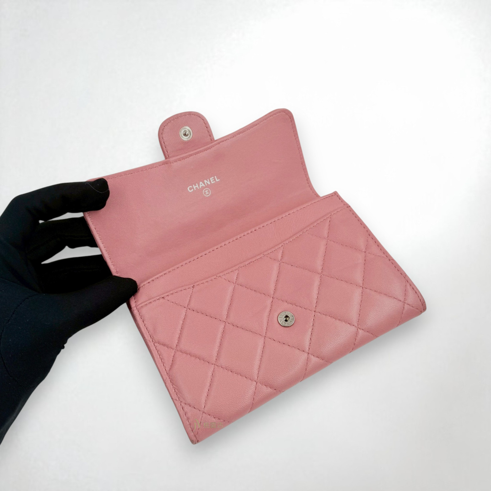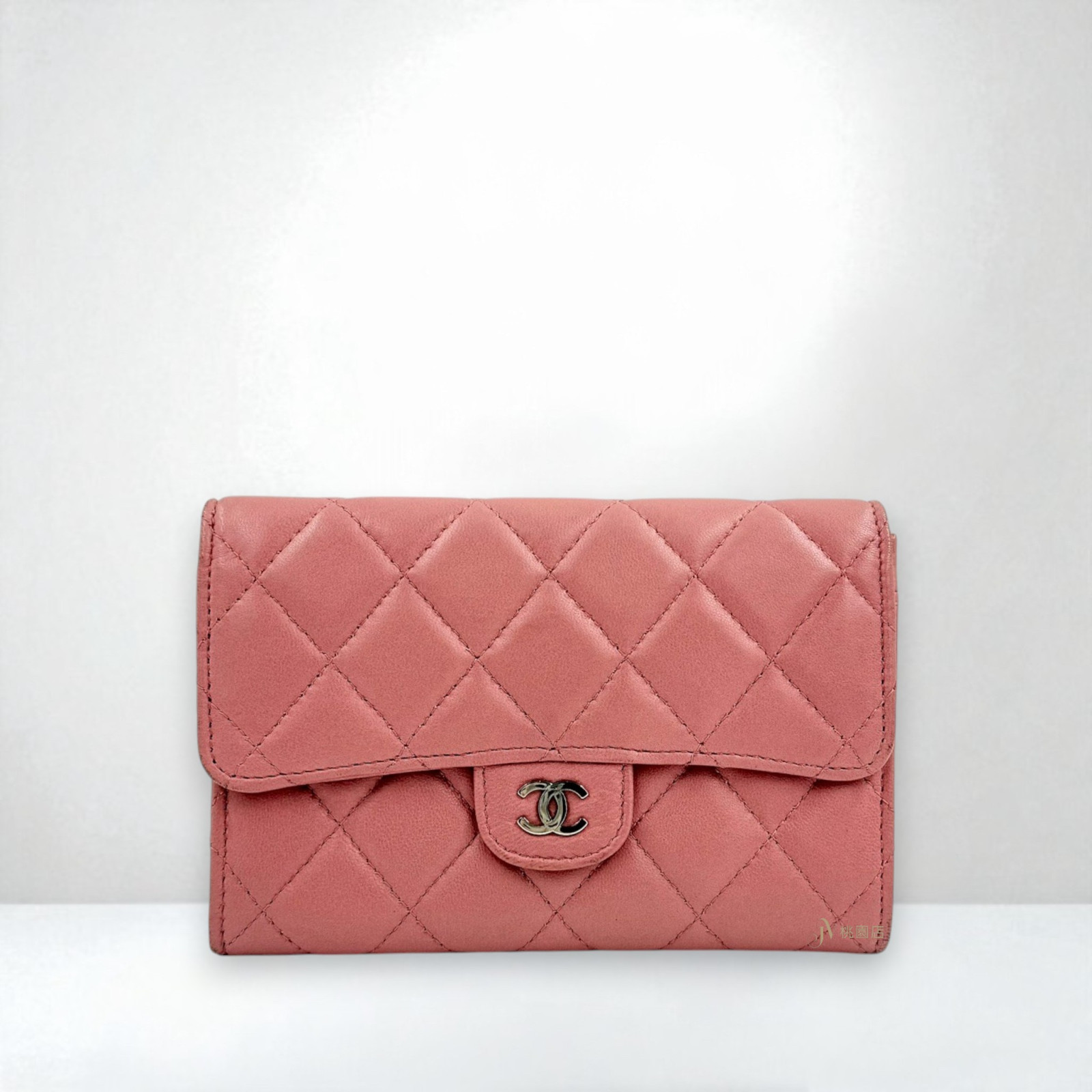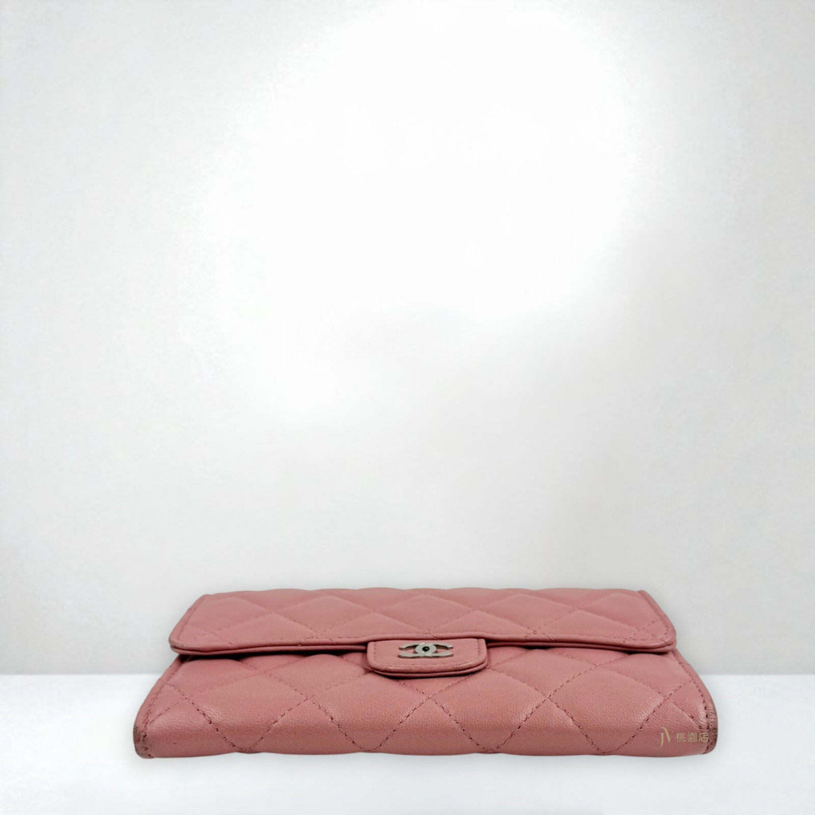 JA2114 CHANEL皮夾 粉色羊皮銀釦下蓋中夾 (桃園店)