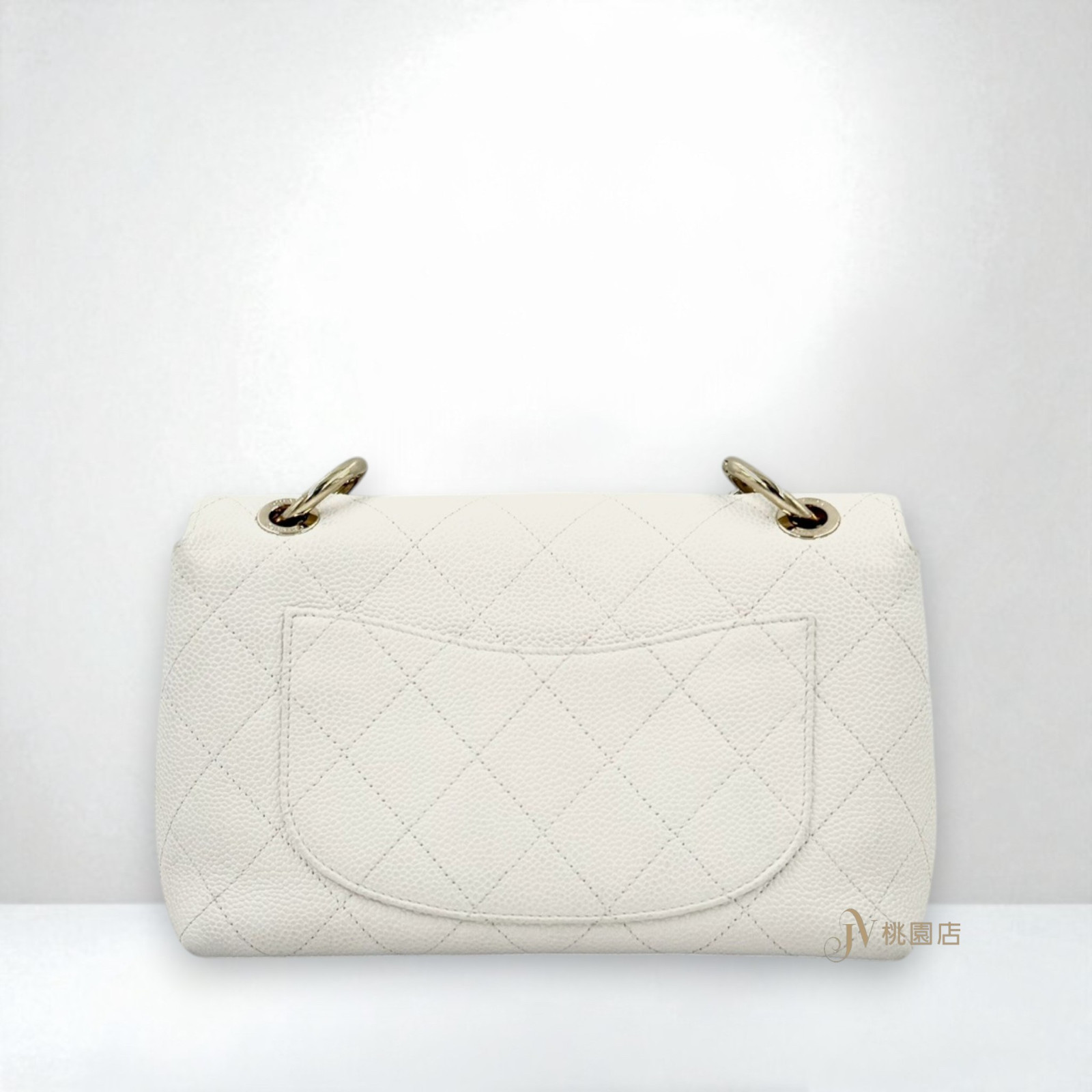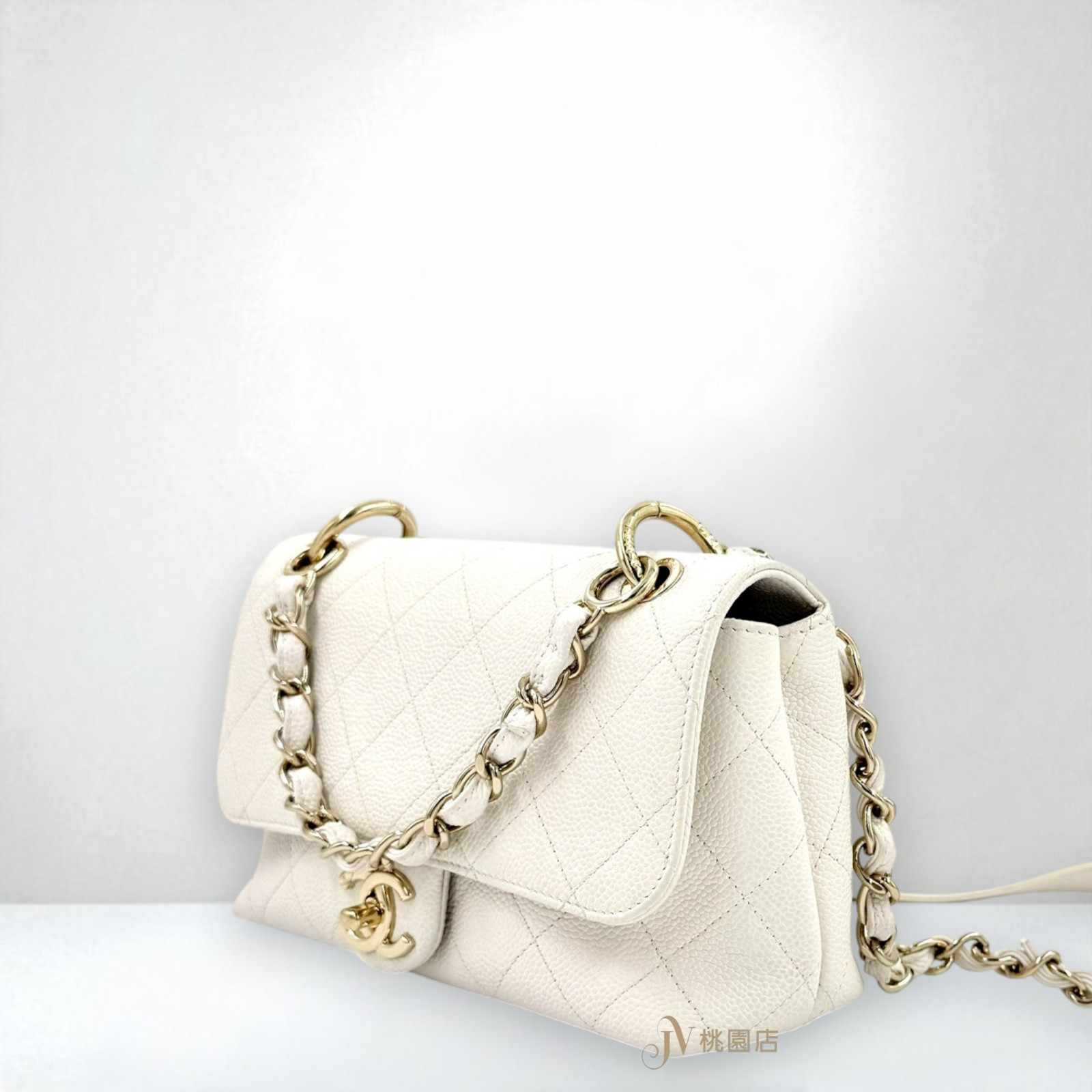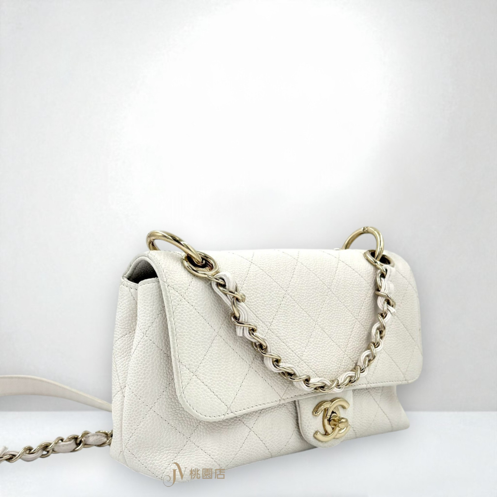 JA2127 CHANEL包包 白色荔枝牛皮淡金釦口蓋側背包 (桃園店)