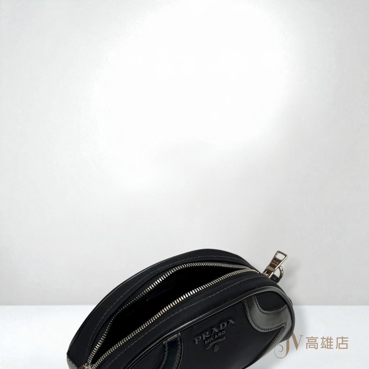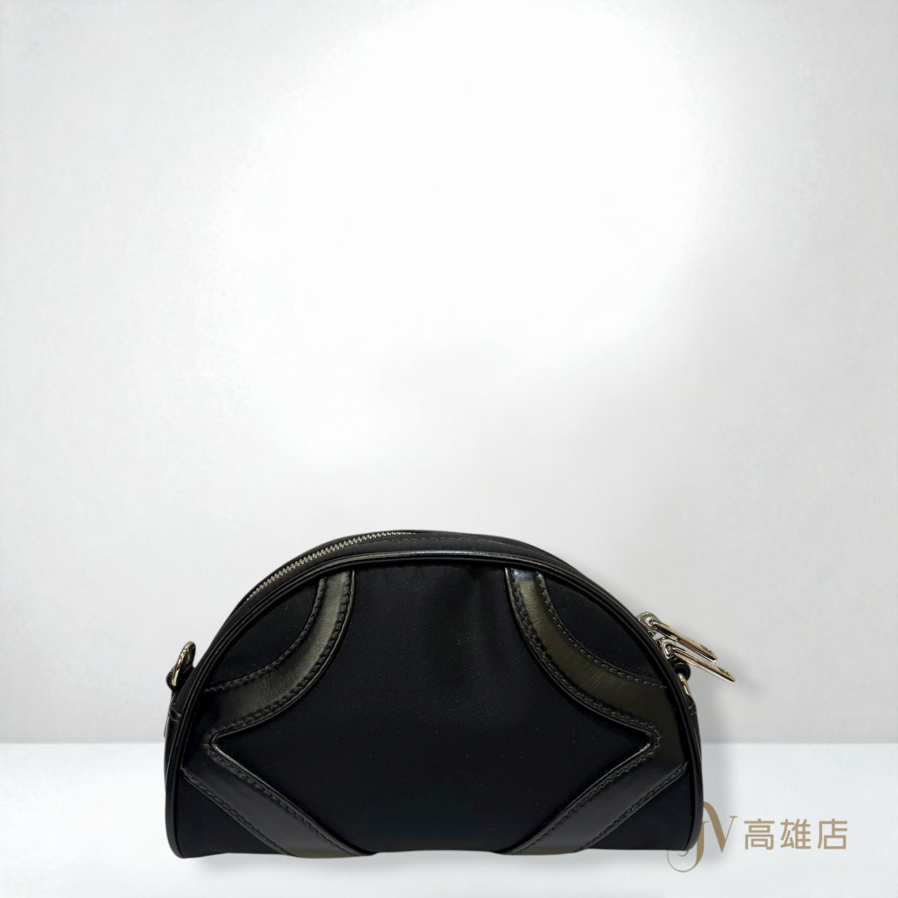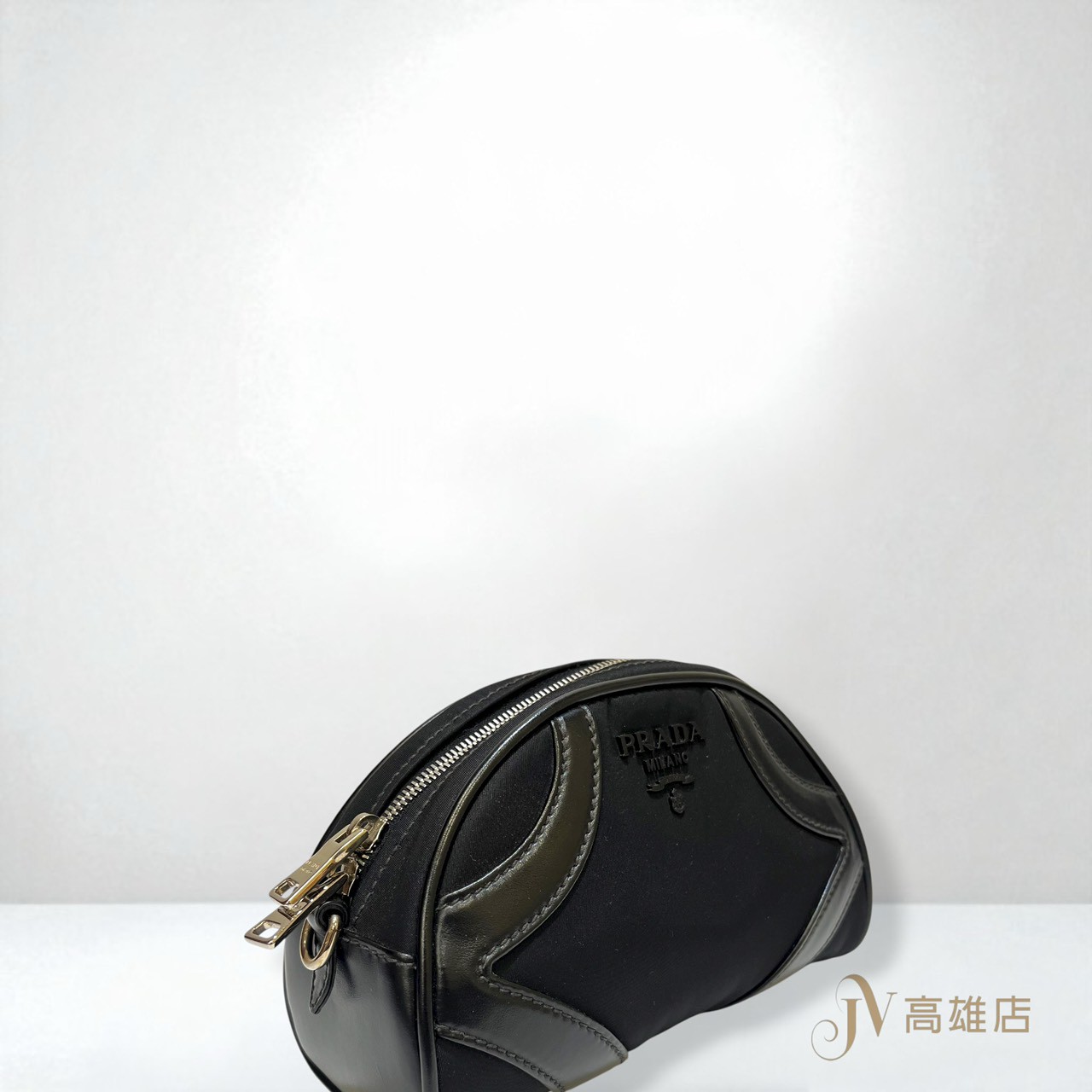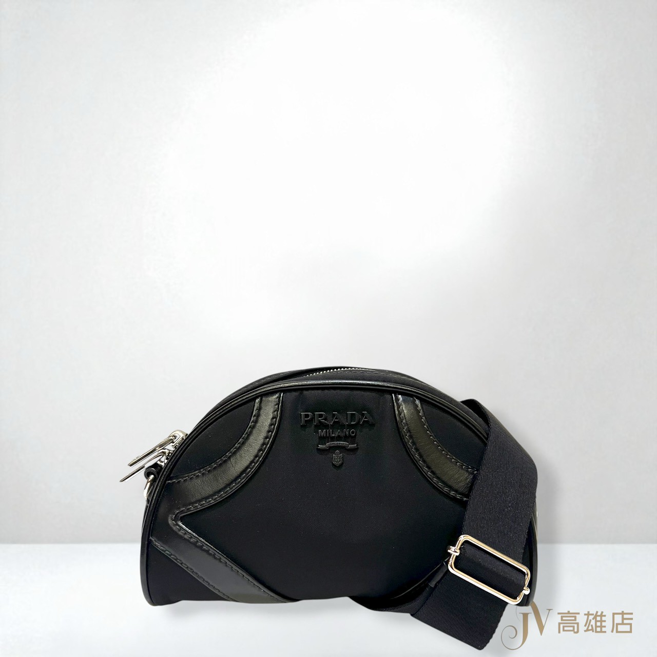JK0087 Prada包包 黑尼龍黑牛皮銀拉鍊斜背保齡球包1BH140(高雄店)