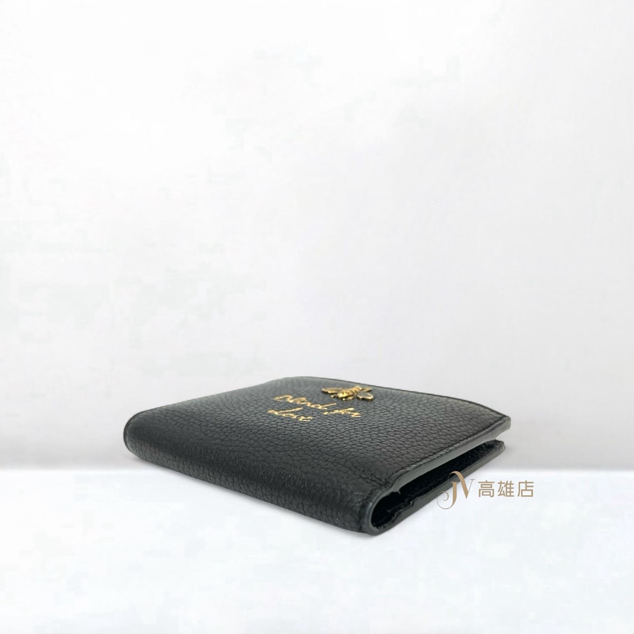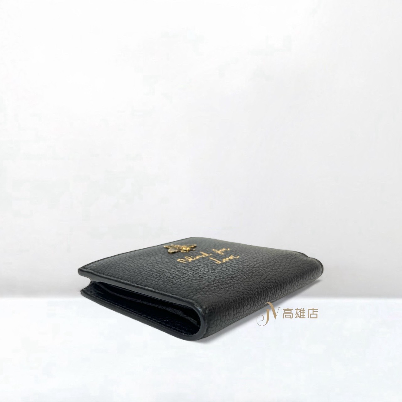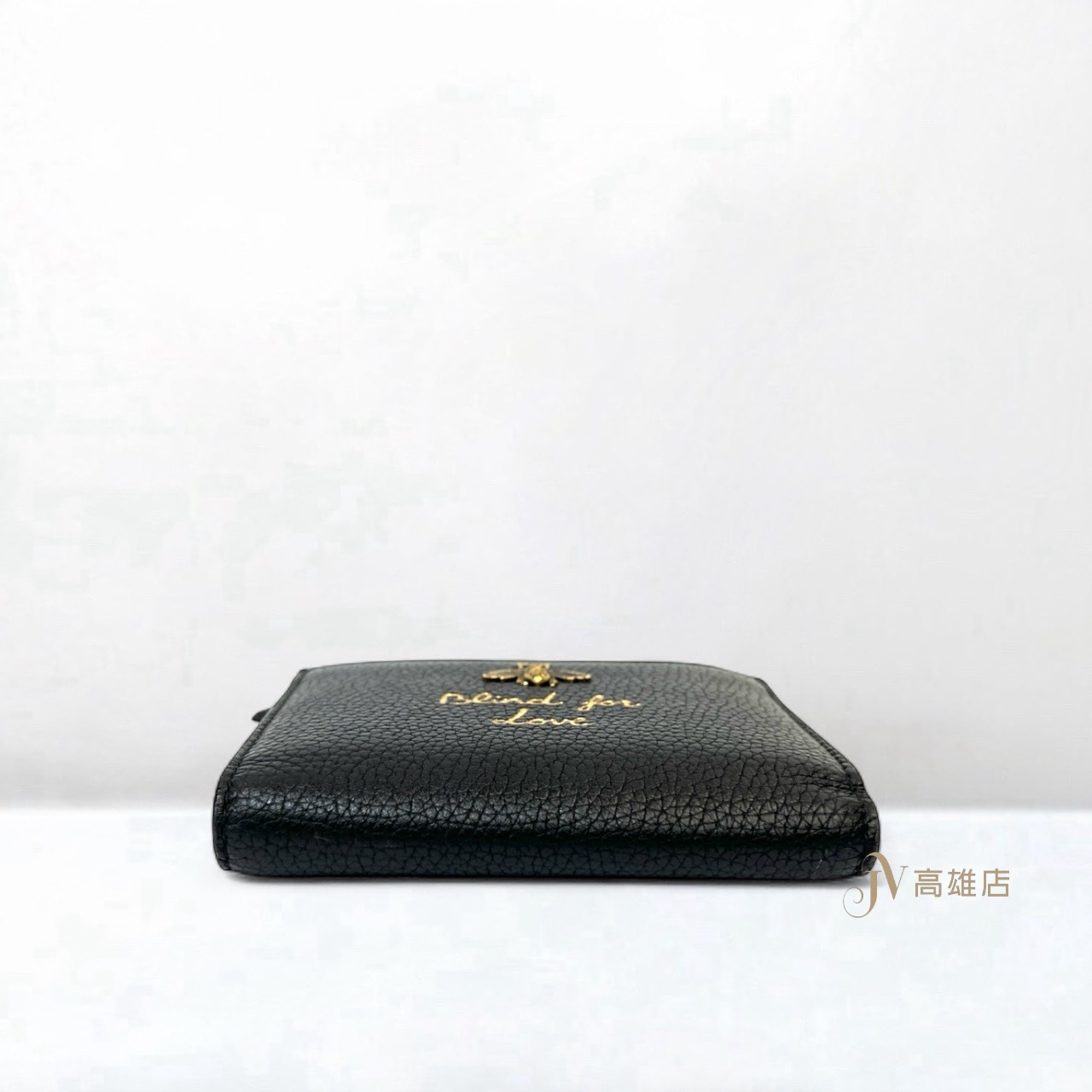 JK0971 Gucci皮夾黑牛皮Blind for Love金蜜蜂金釦對開6卡短夾(喬萱高雄店)