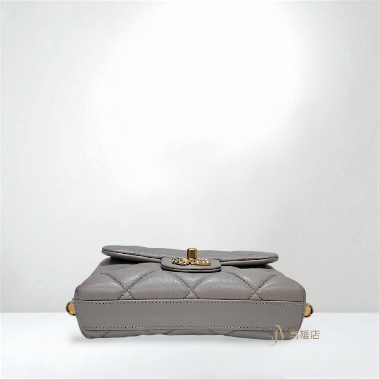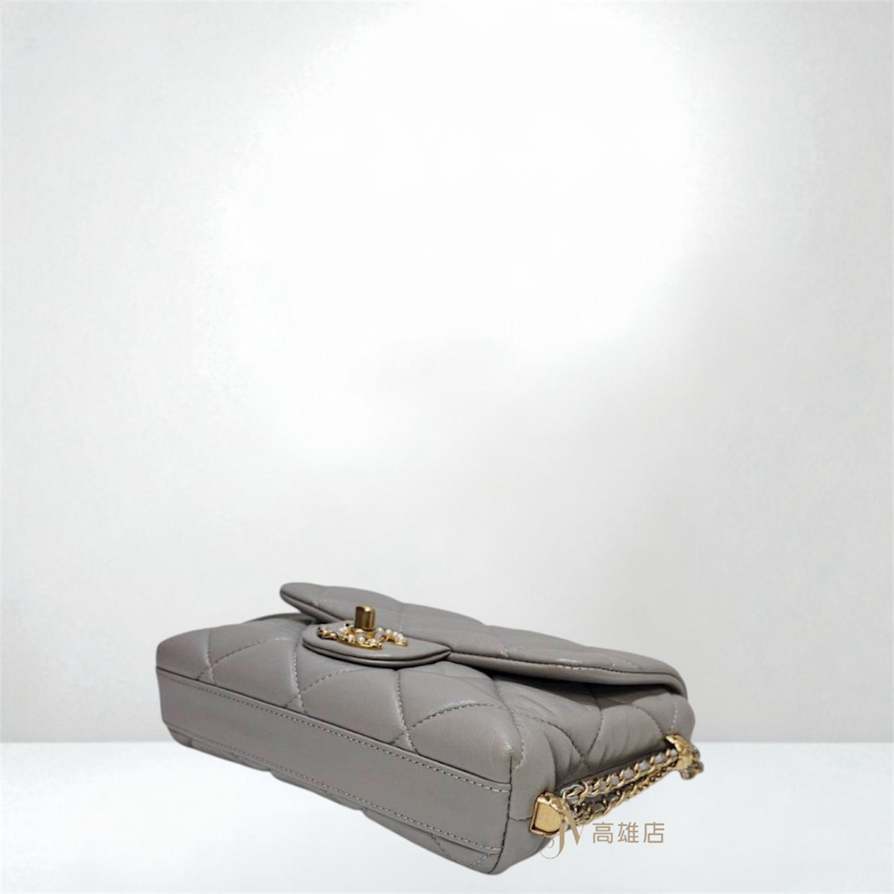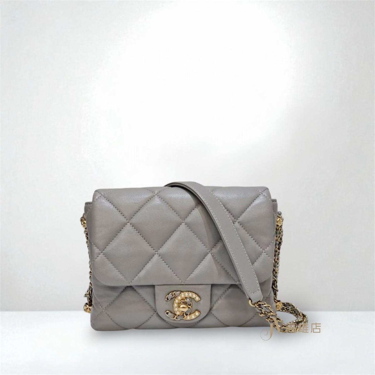 路徑: 首頁 / 精品賣場 / CHANEL / CHANEL-包款 / JK1372 Chanel包包 灰羊皮菱格紋金釦皮穿鍊珍珠Logo下蓋雙鍊肩斜背包AS2588...