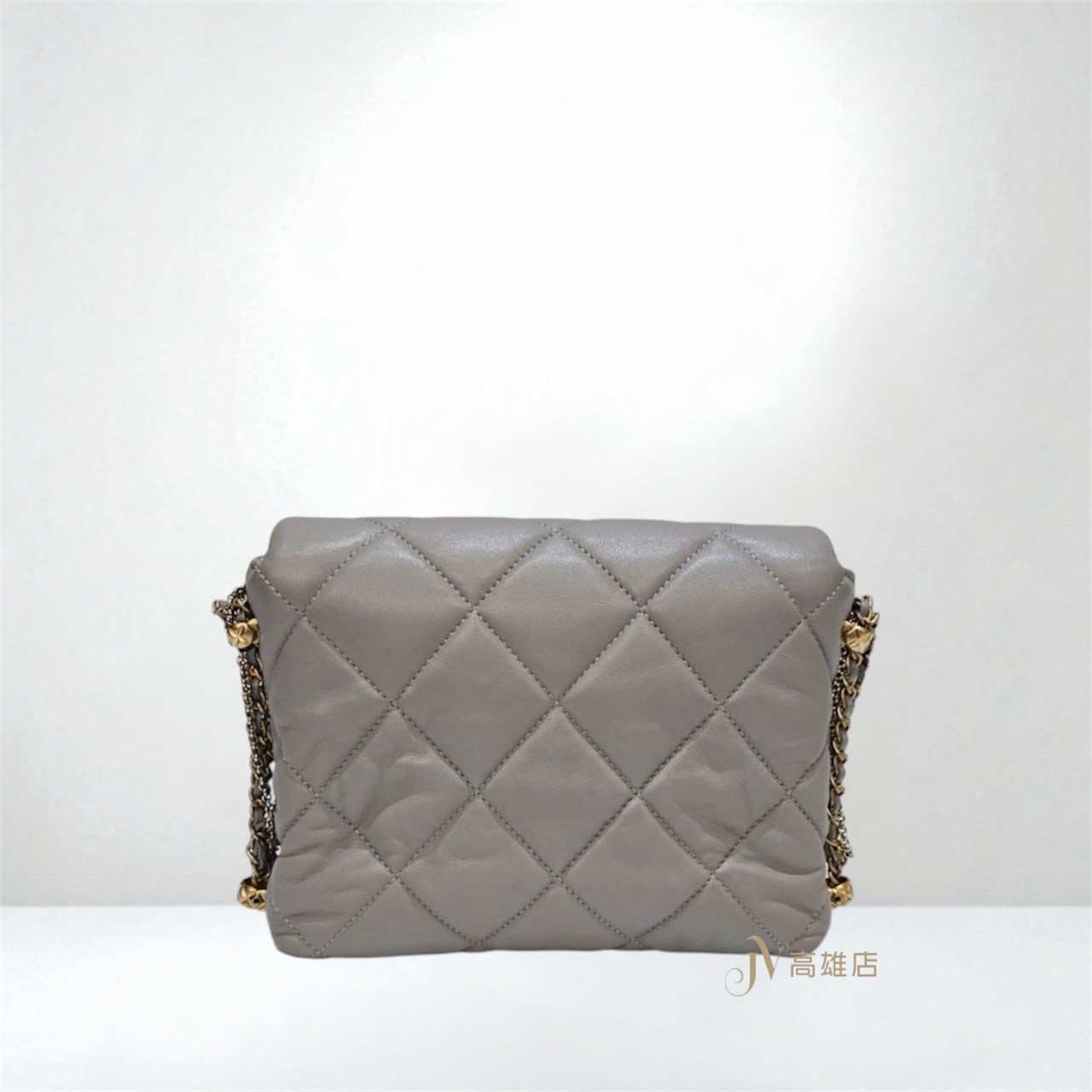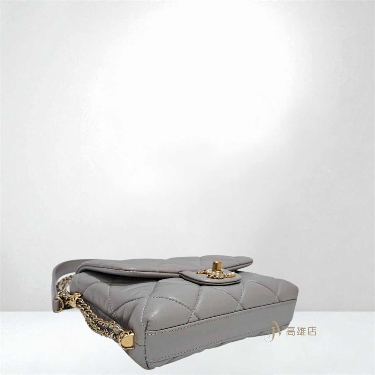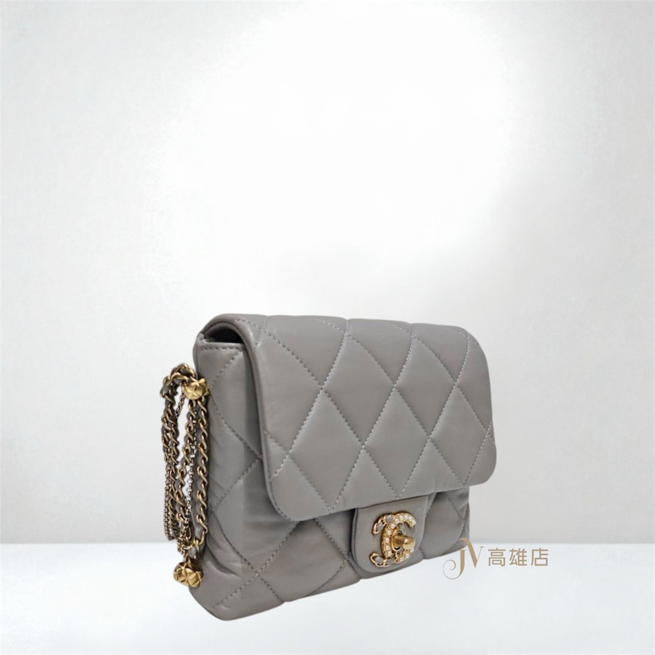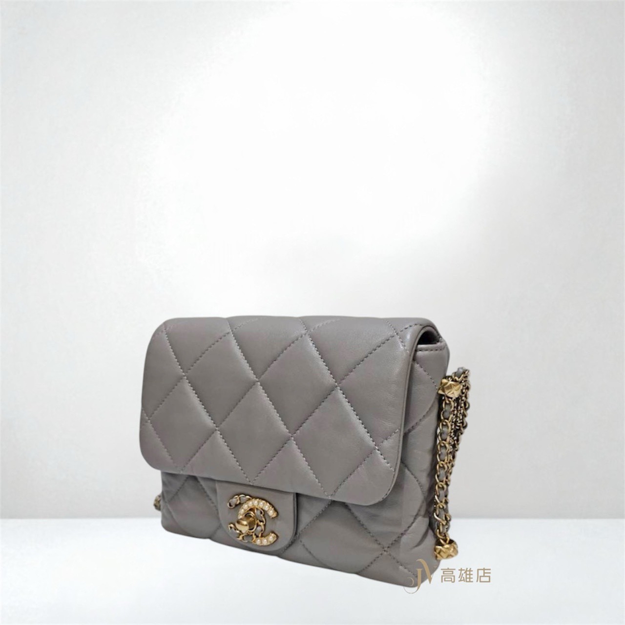 JK1372 Chanel包包 灰羊皮菱格紋金釦皮穿鍊珍珠Logo下蓋雙鍊肩斜背包AS2588(高雄店)