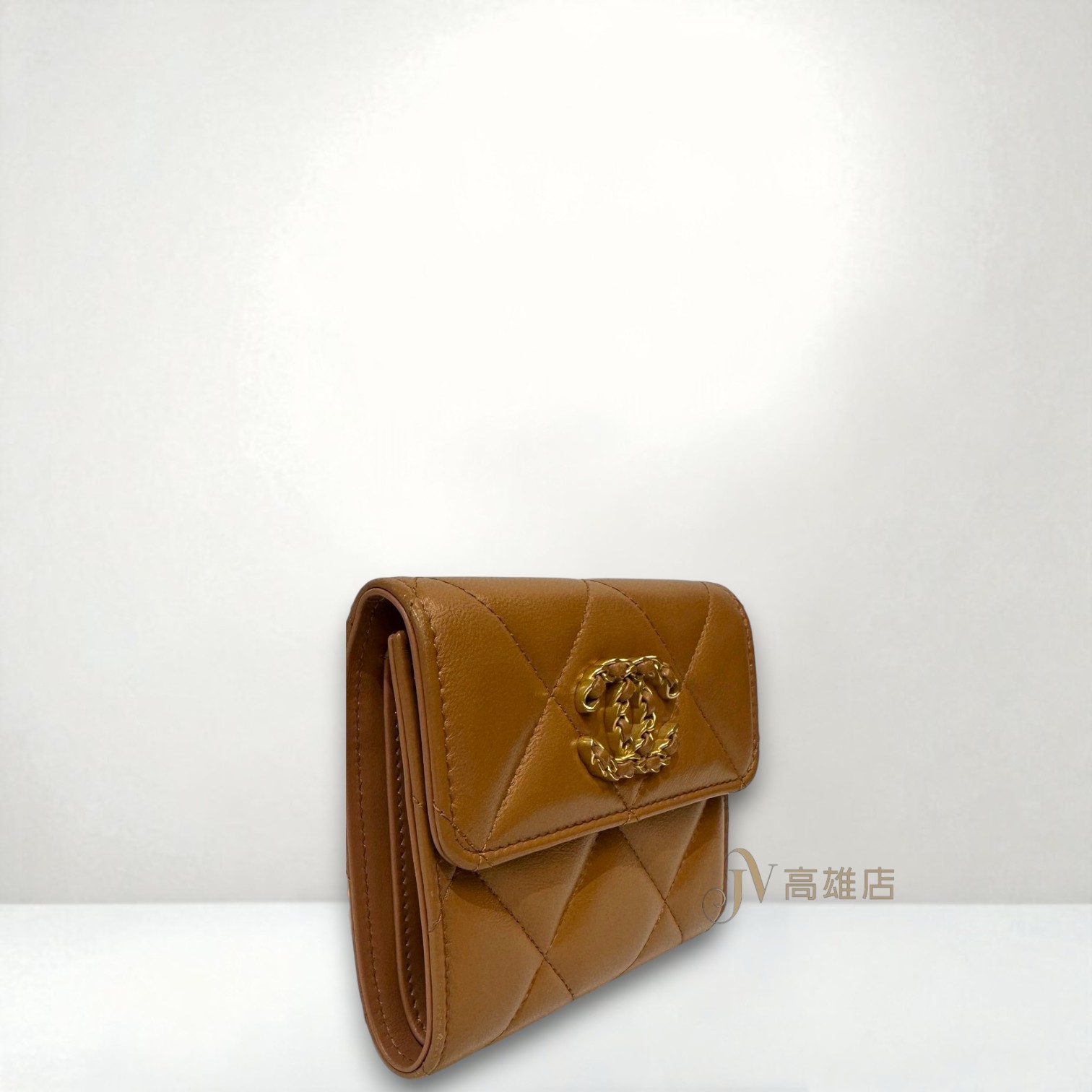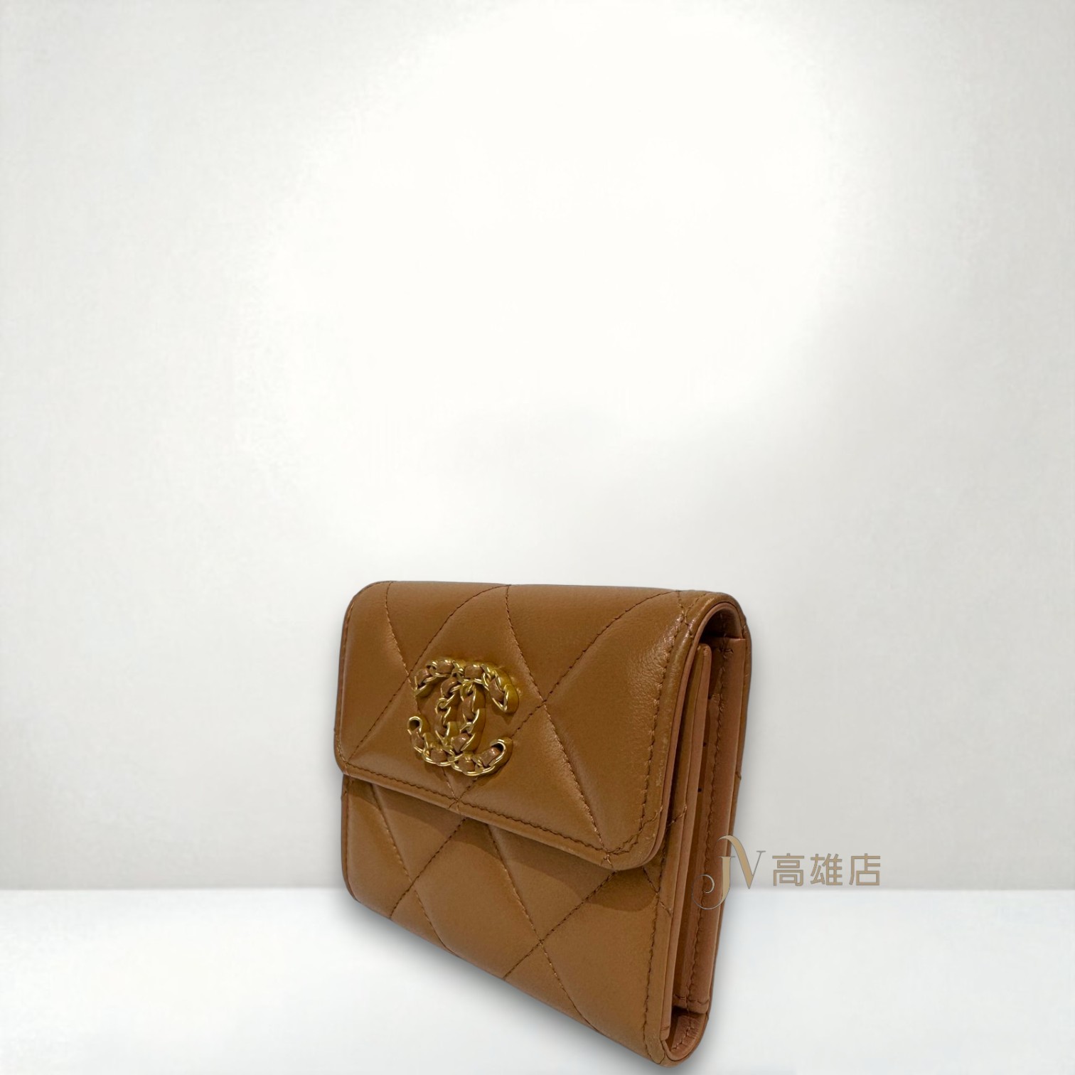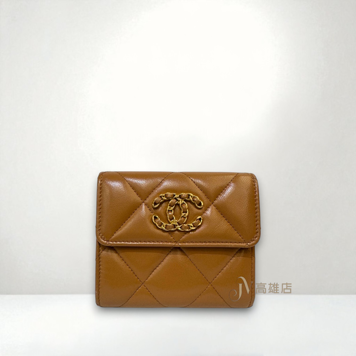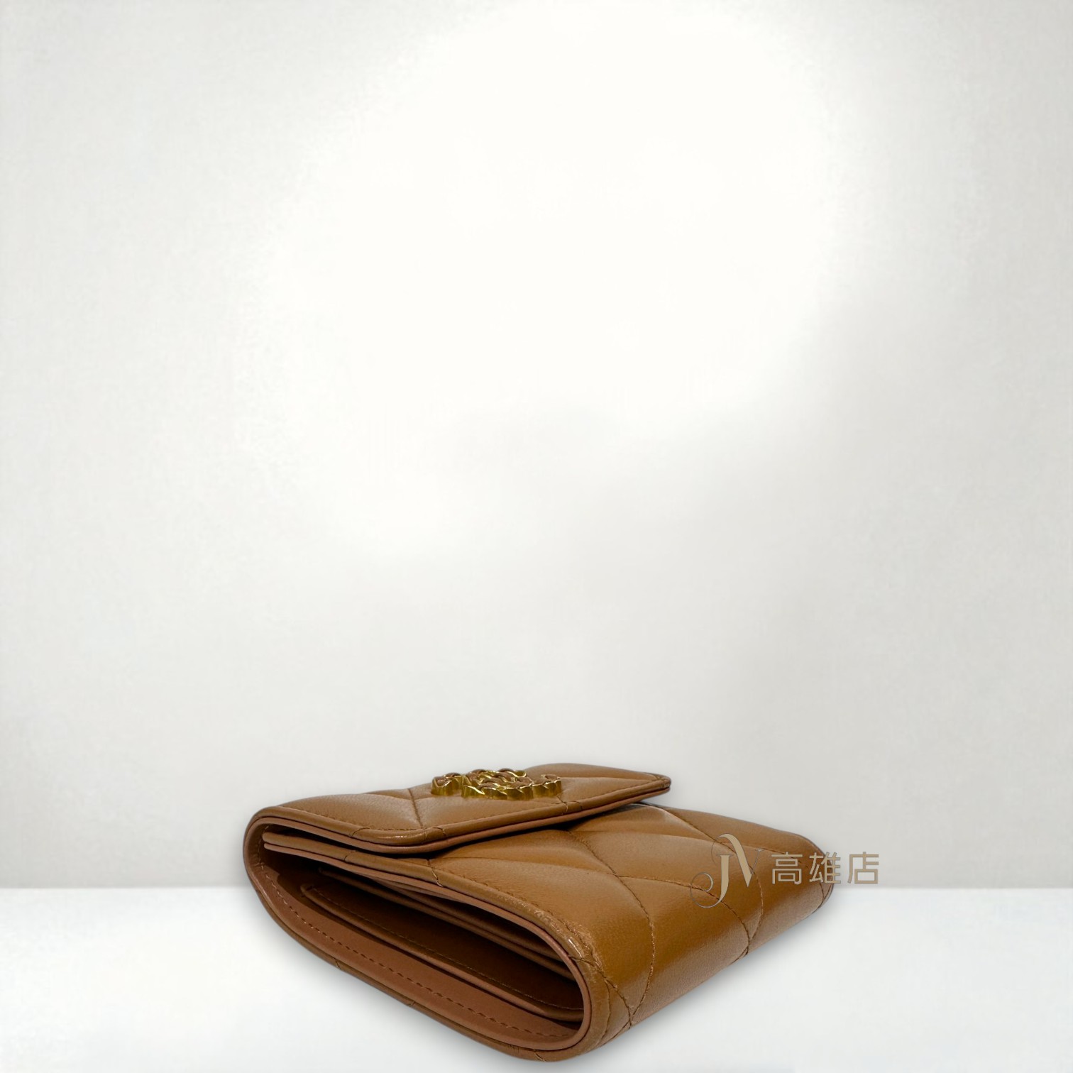JK2075 Chanel短夾 駝色羊皮大菱格紋金釦19系列6卡後零錢袋三折口蓋短夾AP2809(高雄店)