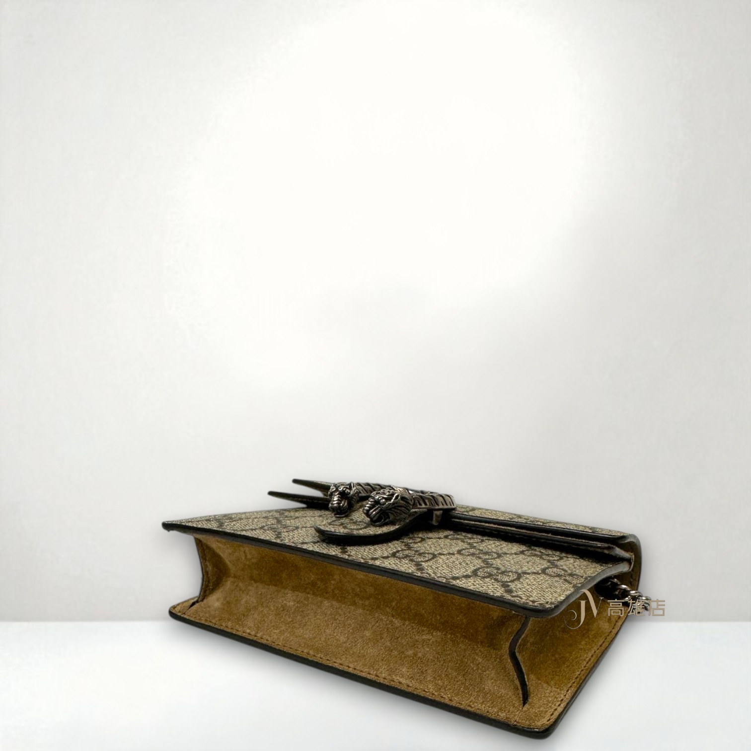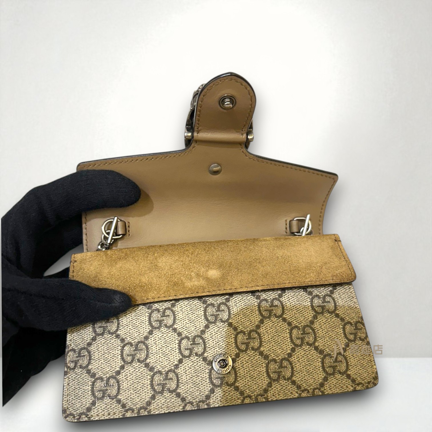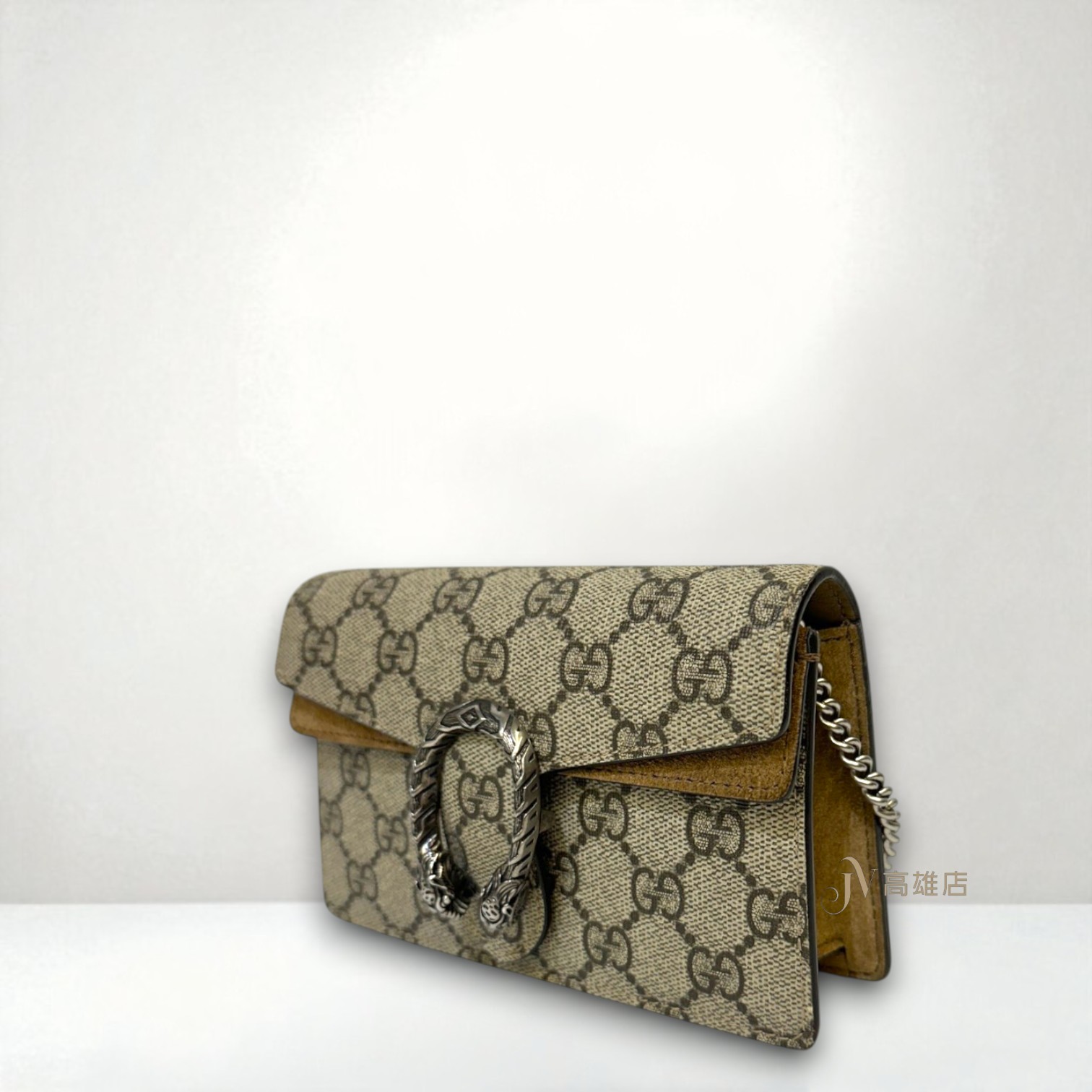 路徑: 首頁 / 精品賣場 / GUCCI / GUCCI-包款 / JP0782 Gucci包包 咖PVC拼麂皮Dionysus Mini銀釦酒神下蓋斜背包(高雄店)...