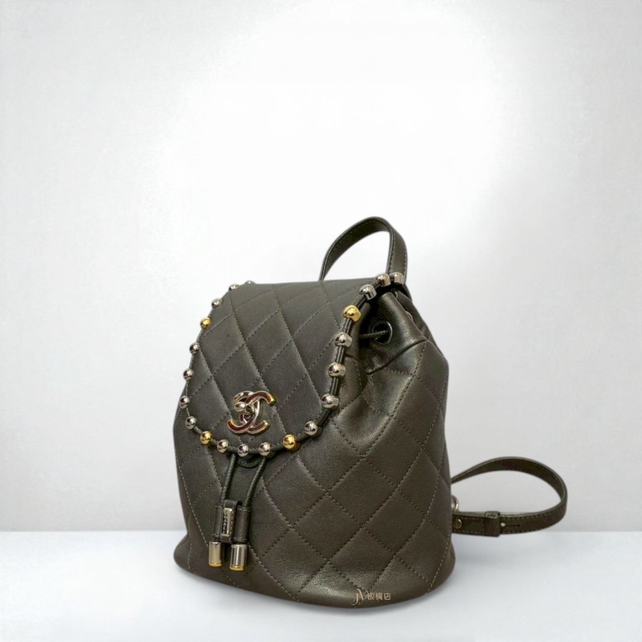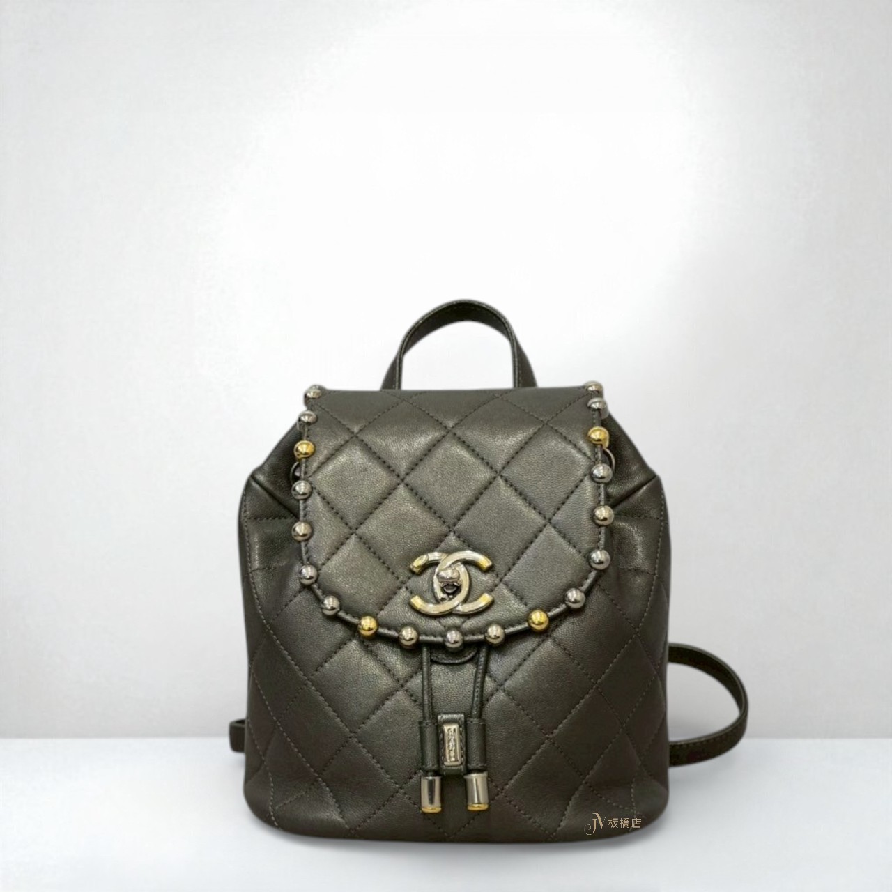 JS0495 CHANEL包包 鐵灰山羊皮菱格金銀鉚釘束口下蓋小後背包/A57156 (板橋店)