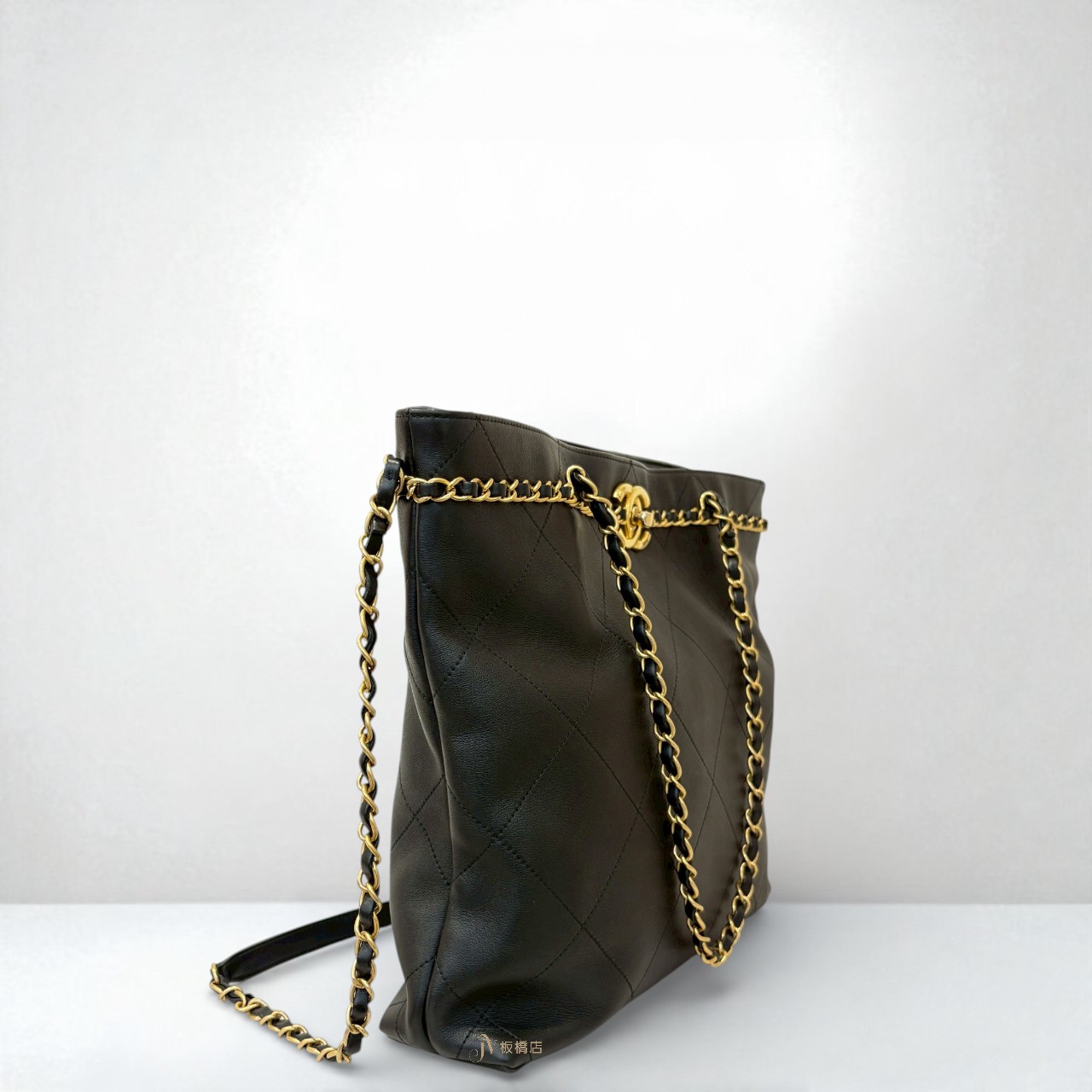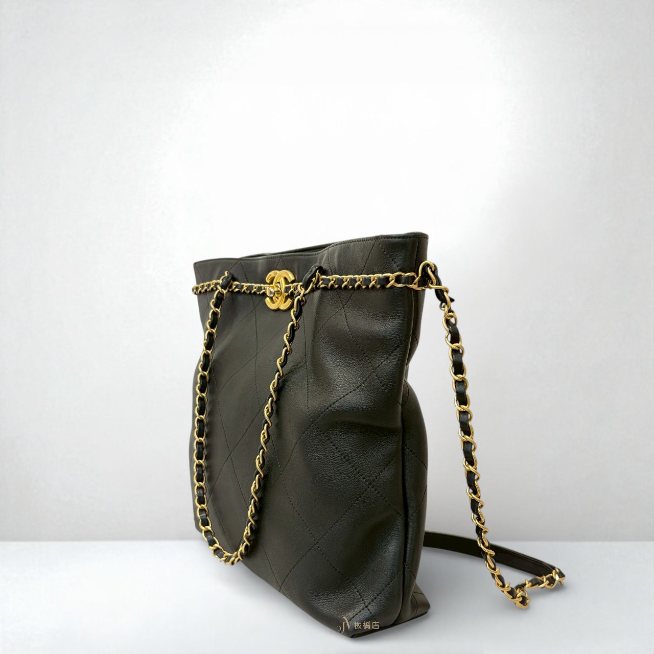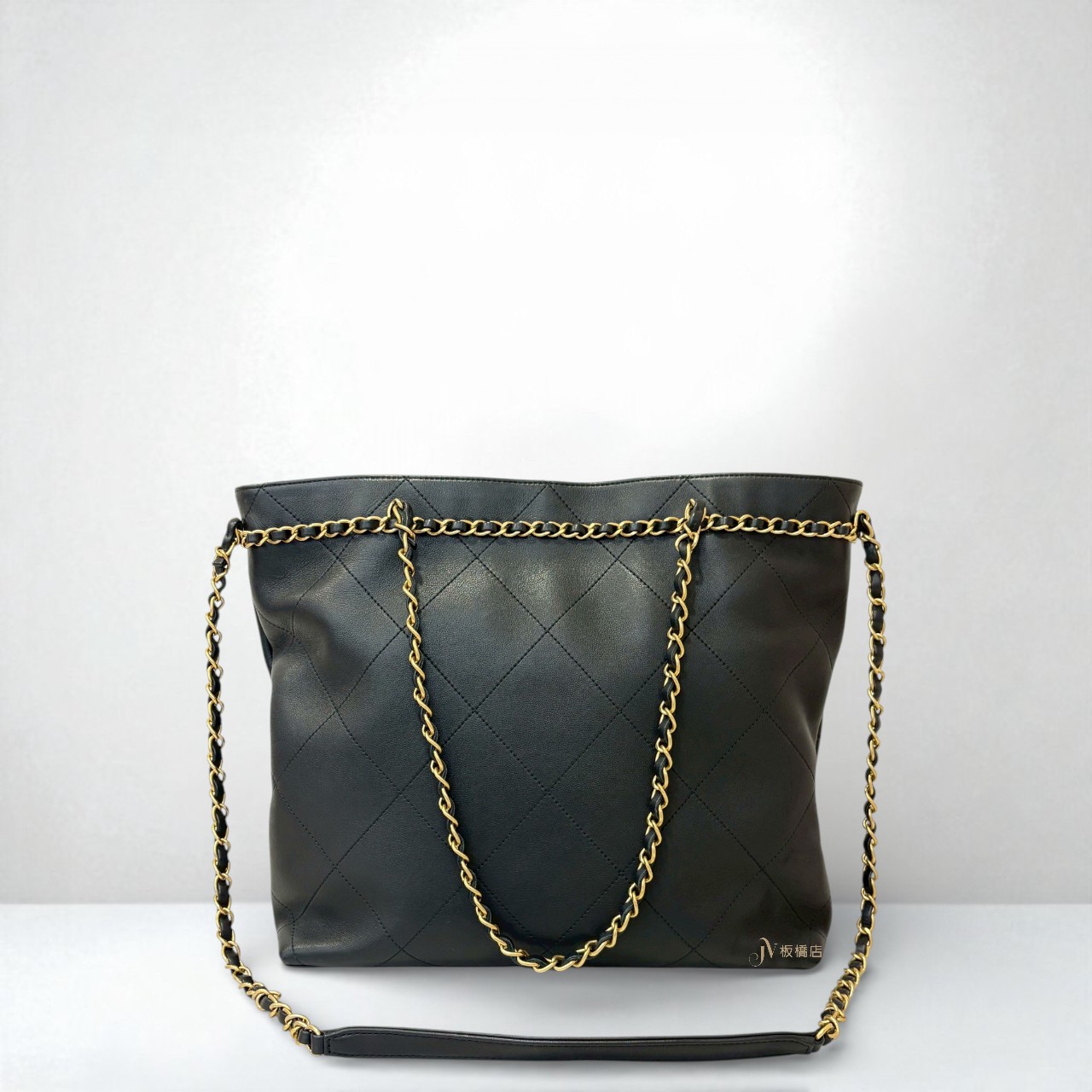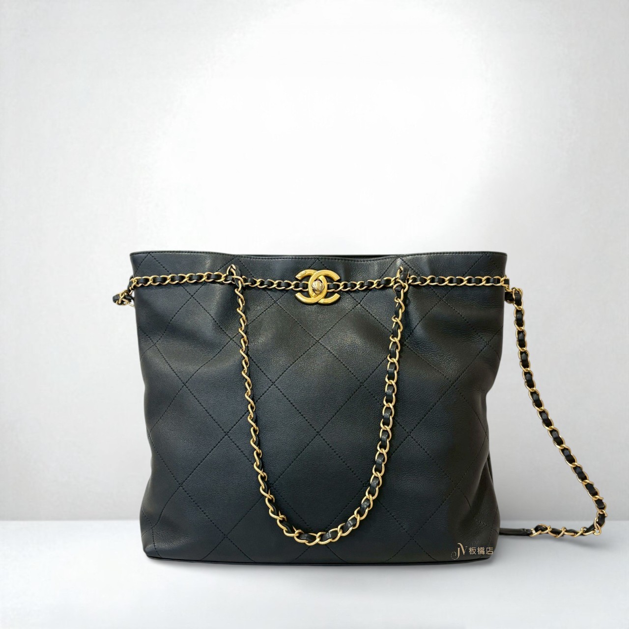 JS0809 CHANEL包包 雙C菱格紋黑色牛皮金釦托特包AS2374 (板橋店)