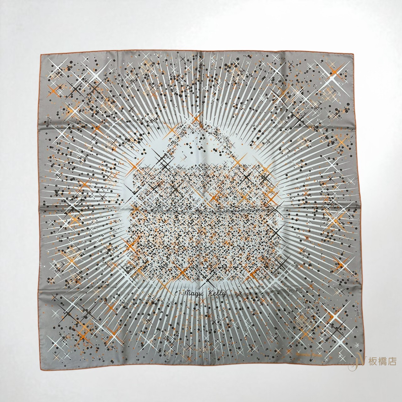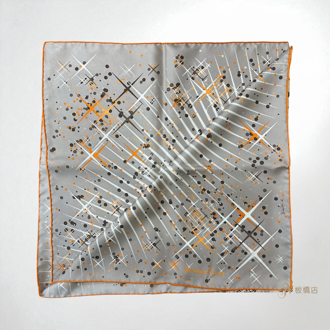 路徑: 首頁 / 精品賣場 / Hermes / Hermes-配件 / JS1048 Hermes絲巾 灰底橘邊點點十字光芒方絲巾 90×90 (板橋店)...