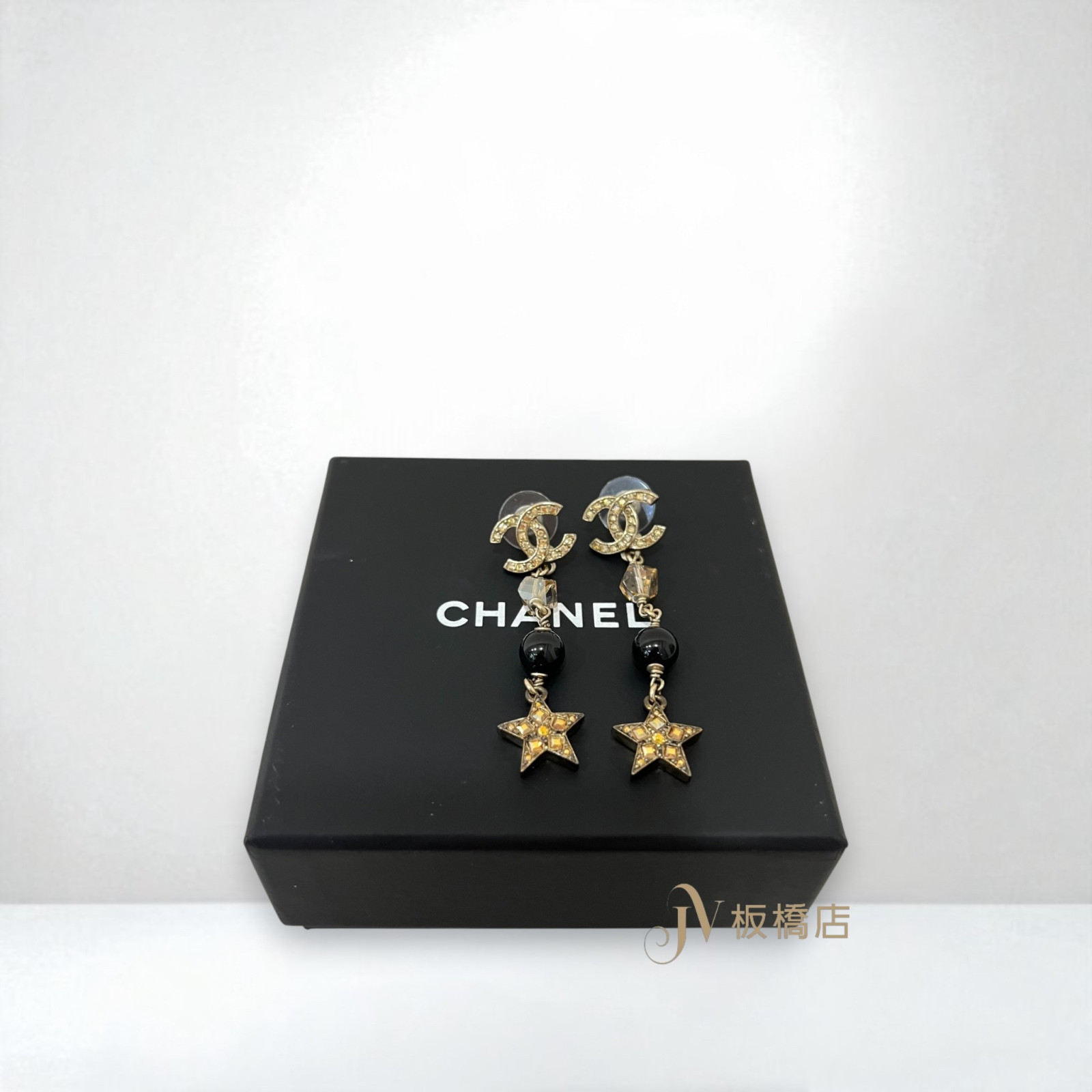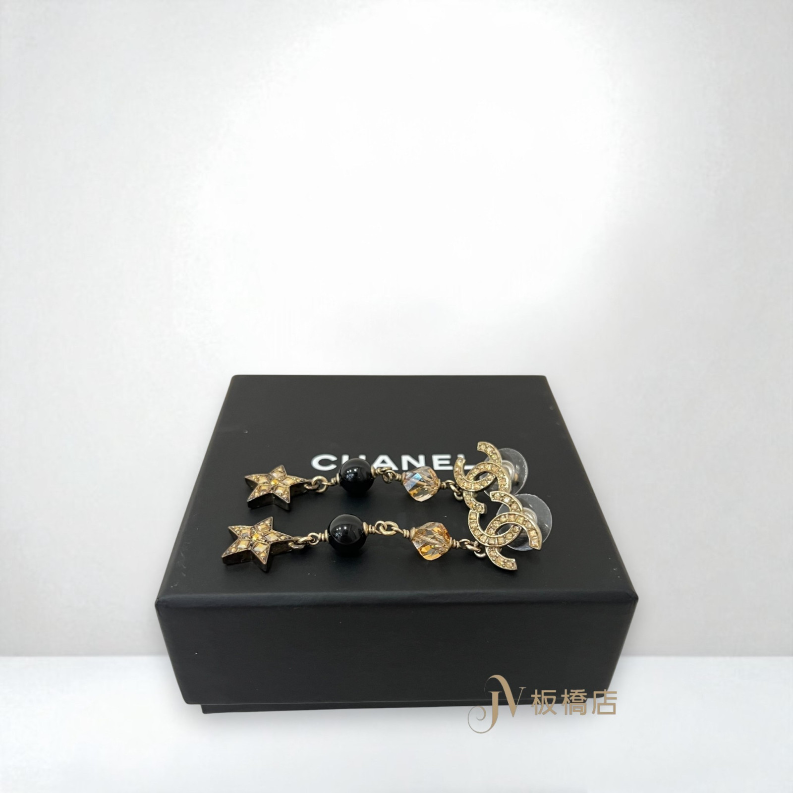 JS1062 CHANEL耳環 黃色水鑽雙C垂墜串珠星星耳環 (板橋店)