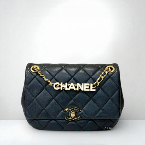 • JS1247 Chanel包包 黑金羊皮黑琺瑯logo皮穿拼黑白字母鍊下蓋包 (板橋店)