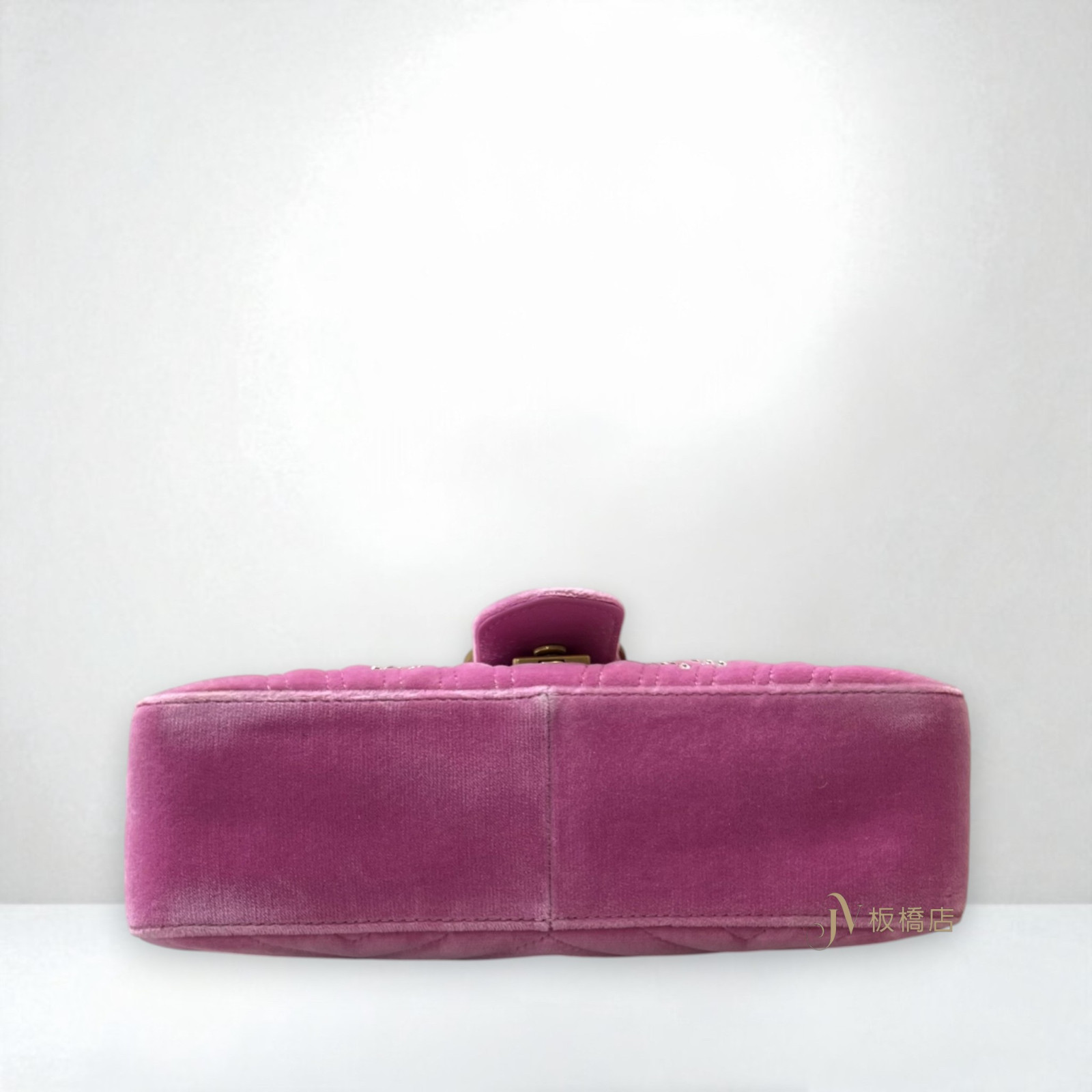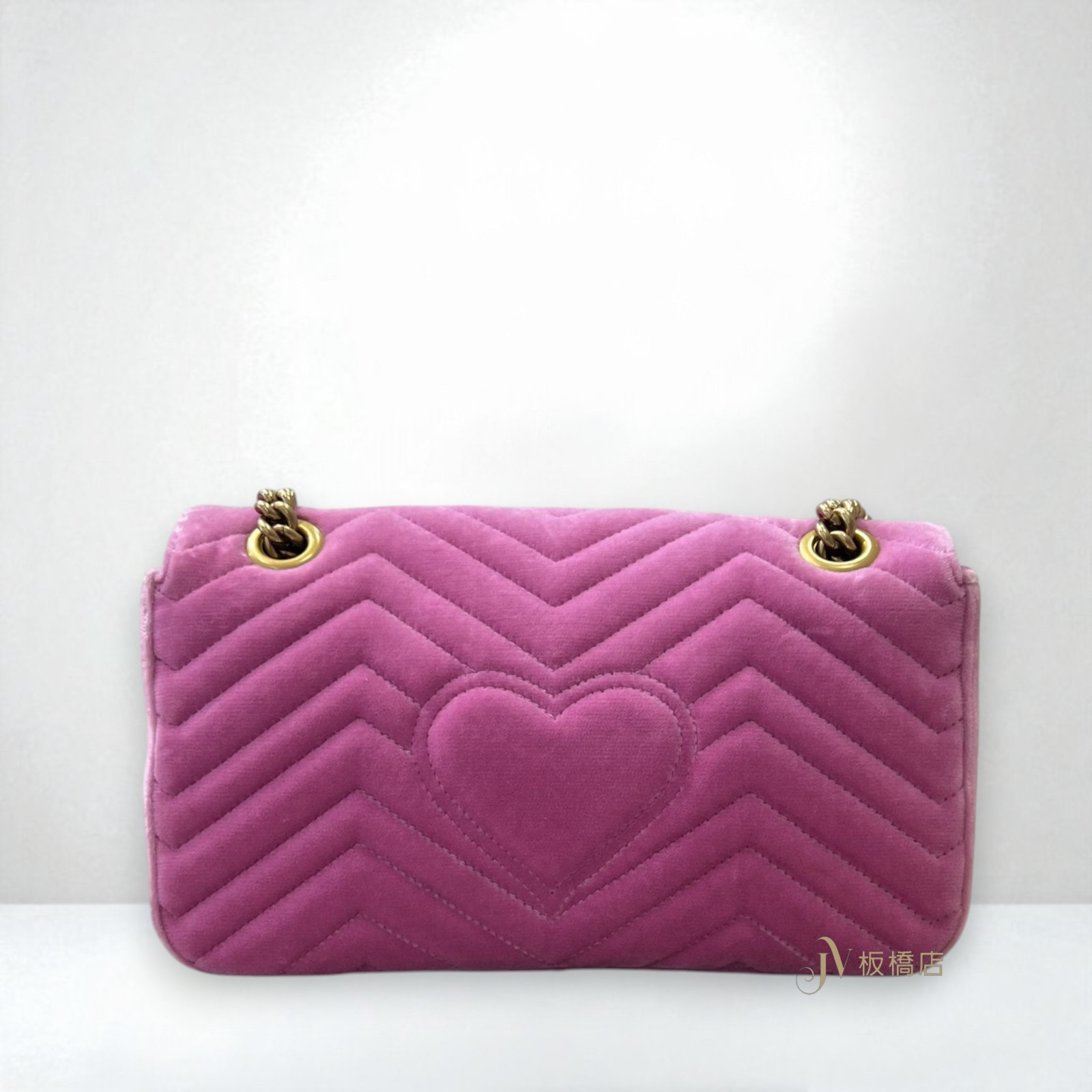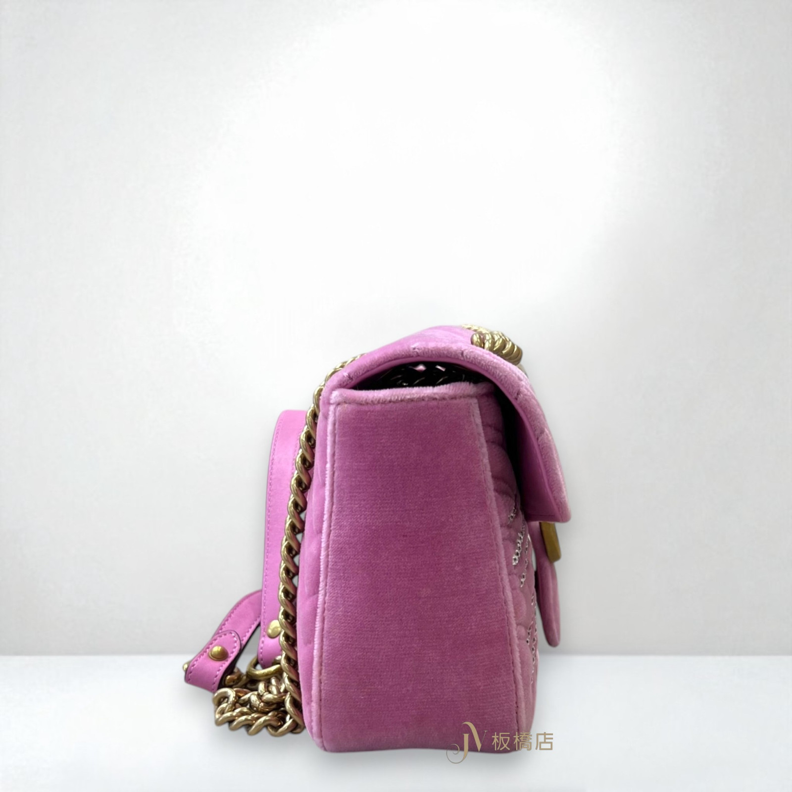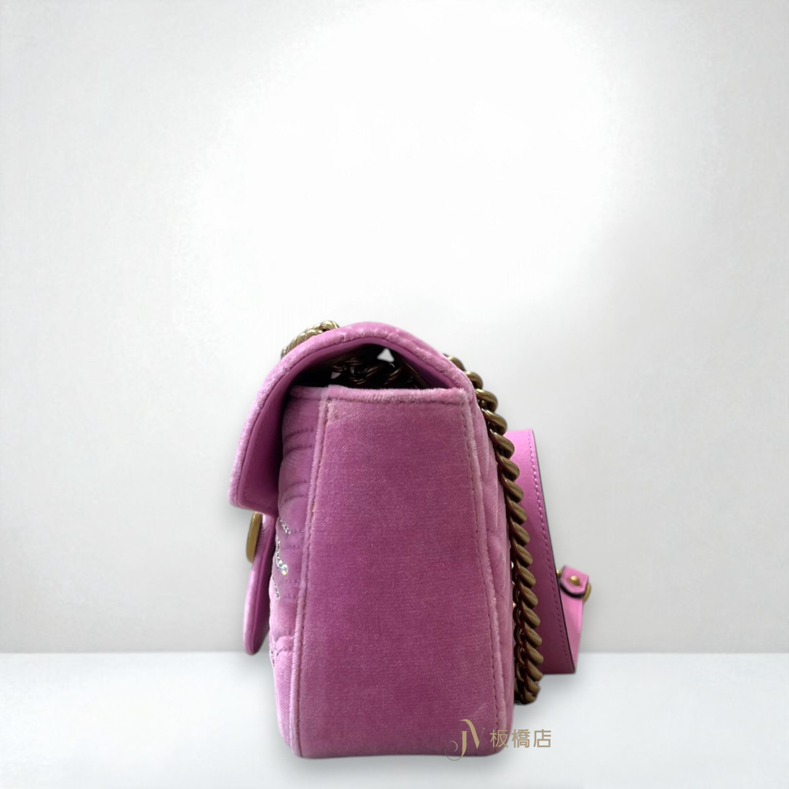 路徑: 首頁 / 精品賣場 / GUCCI / GUCCI-包款 / JY0374 GUCCI包包 MARMONT 粉絲絨布復古金釦鑲寶石小號下蓋斜肩背包 443497 (板橋店)...